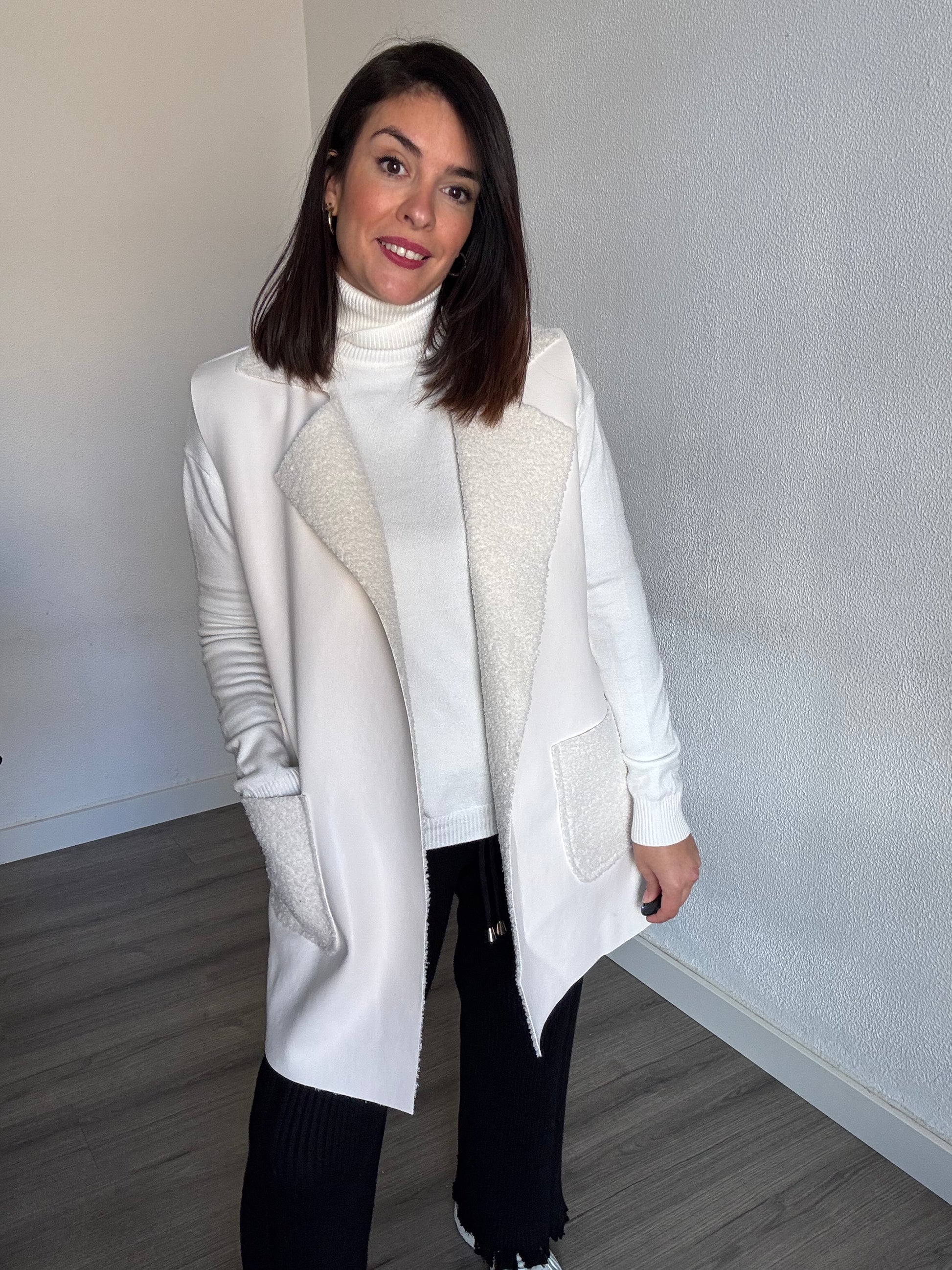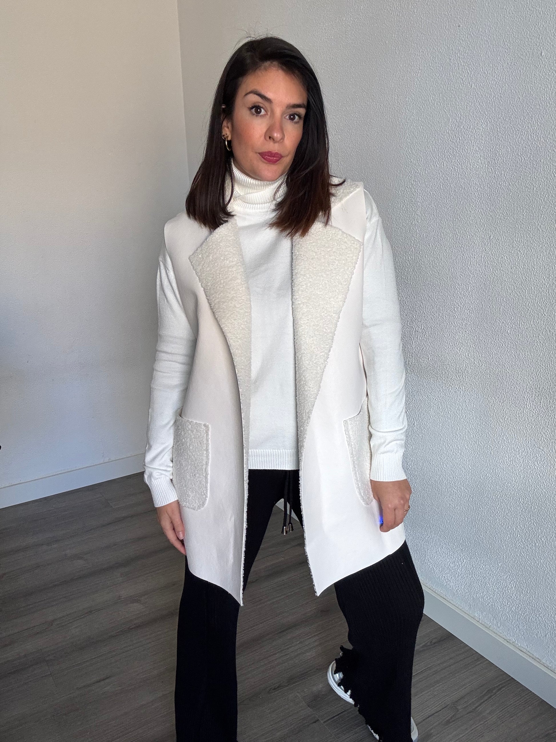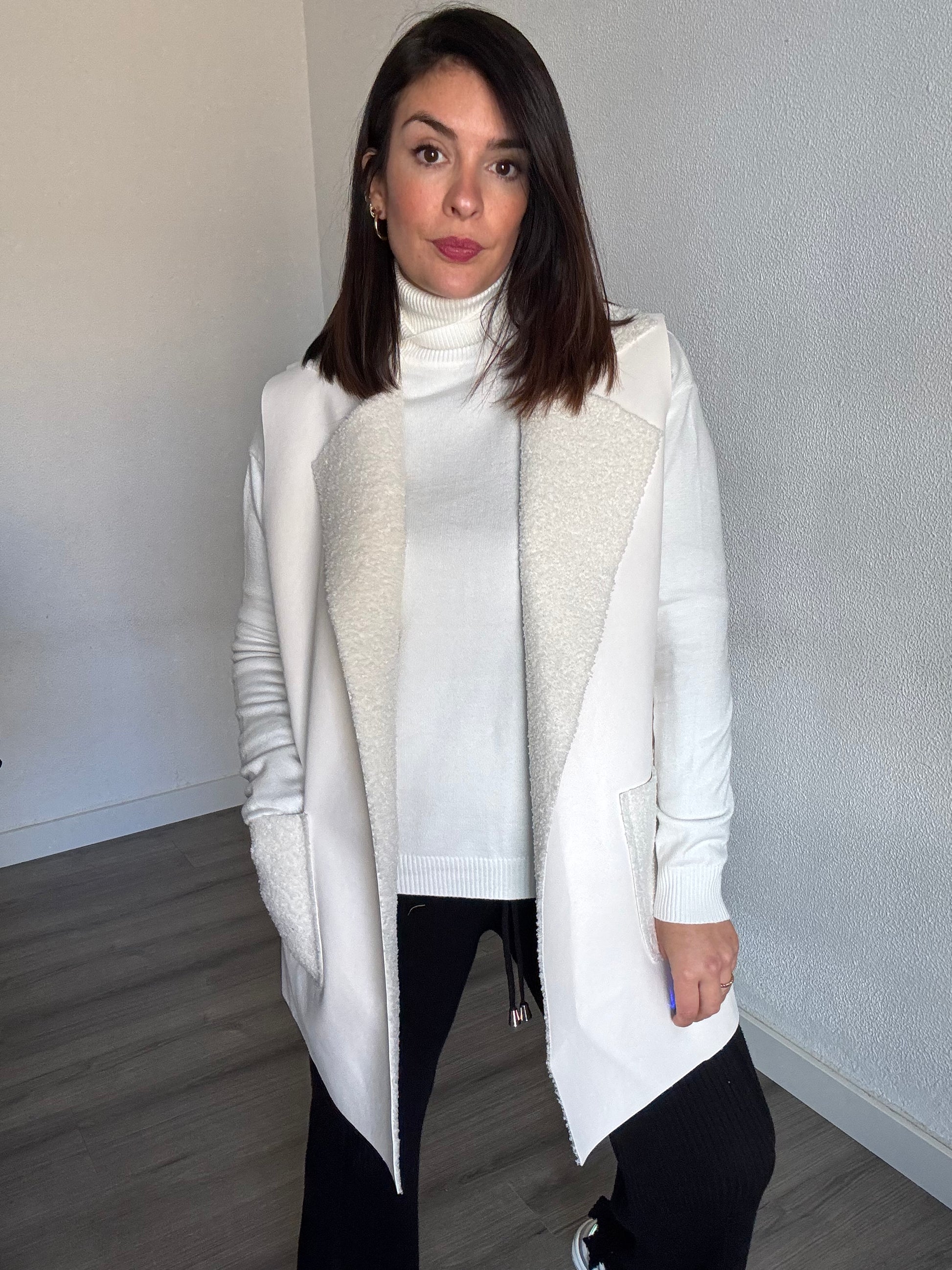 Abrigo sin mangas que combina efecto piel y borreguito, con bolsillos delanteros y amplias solapas.