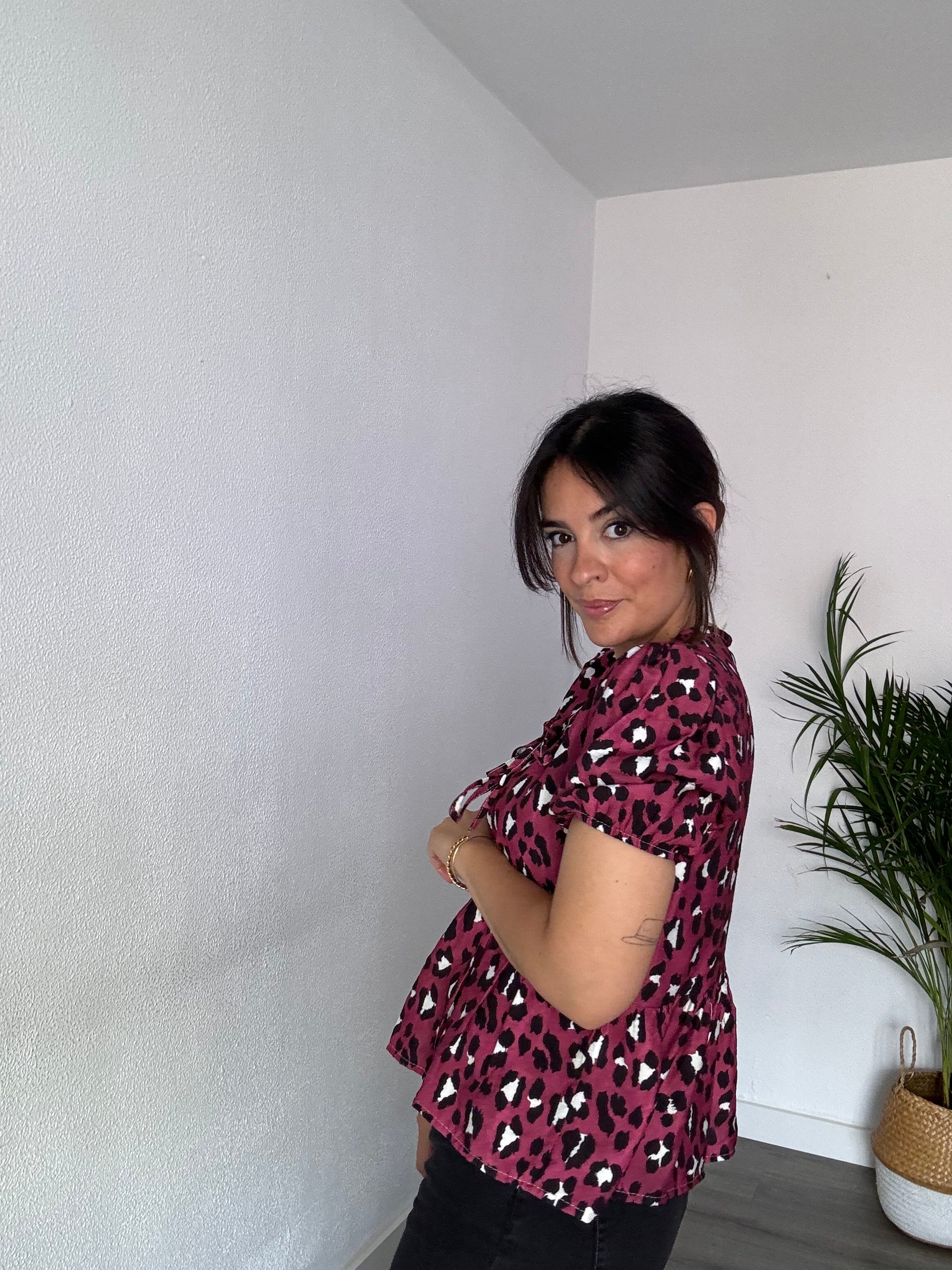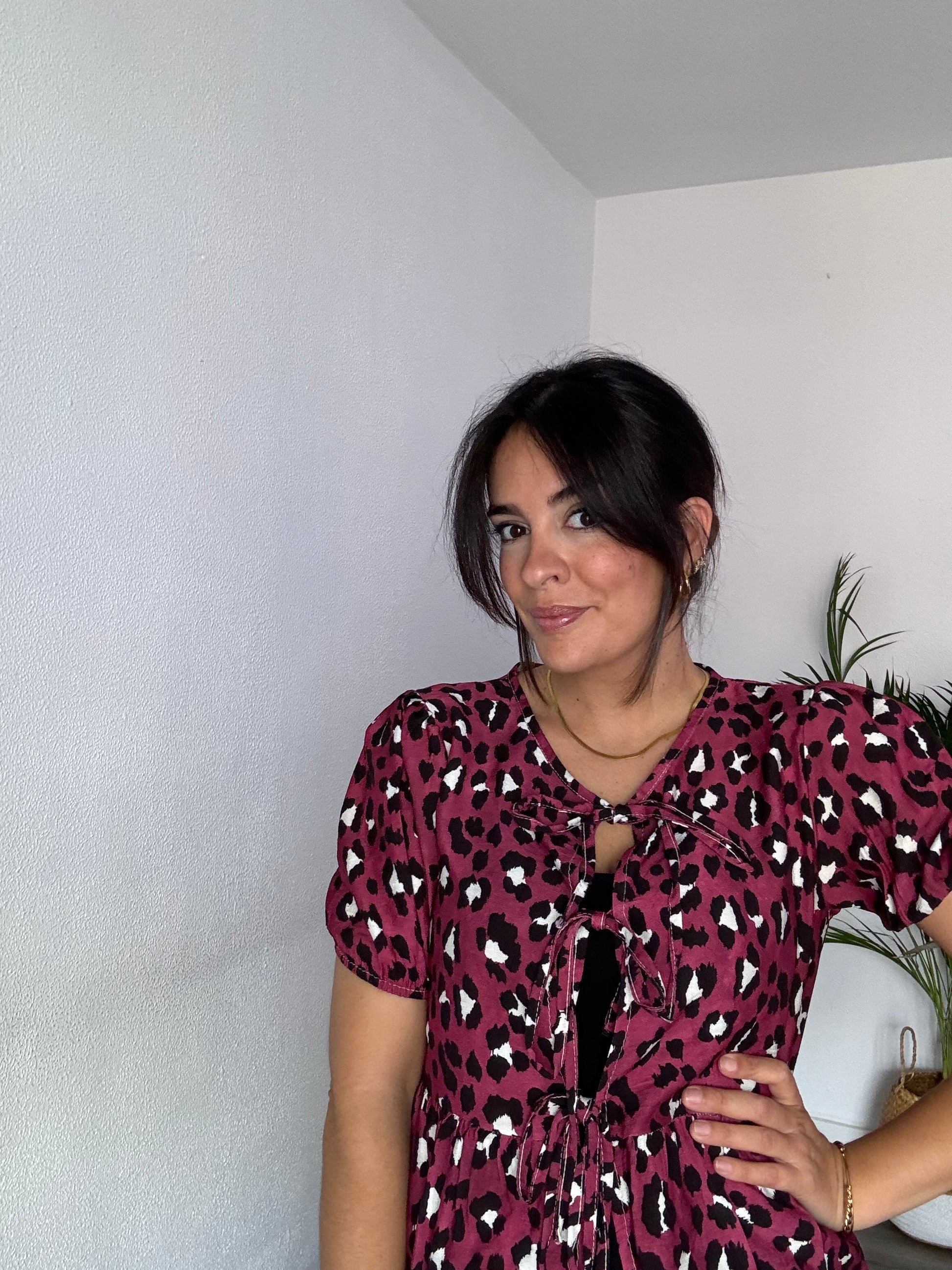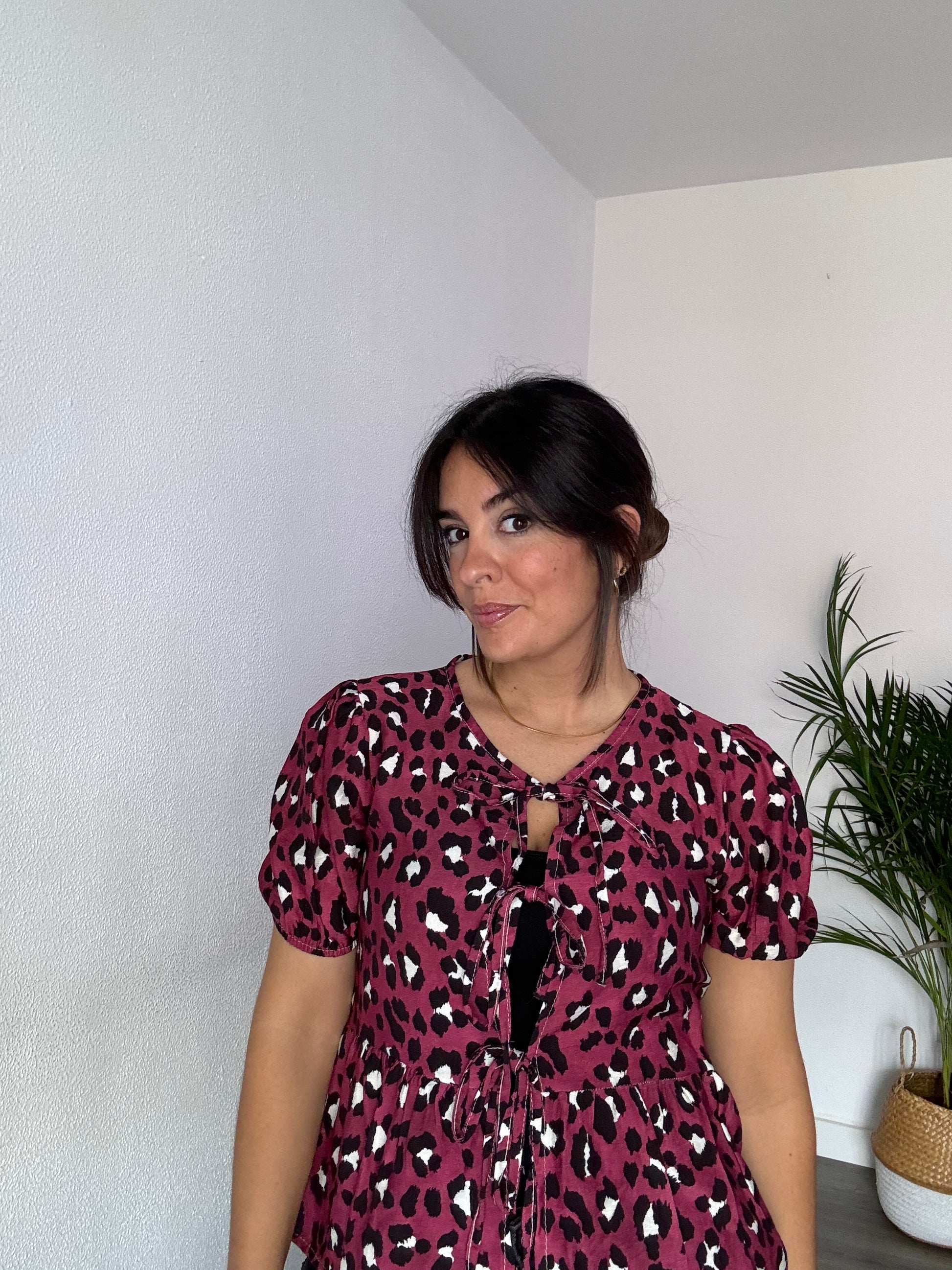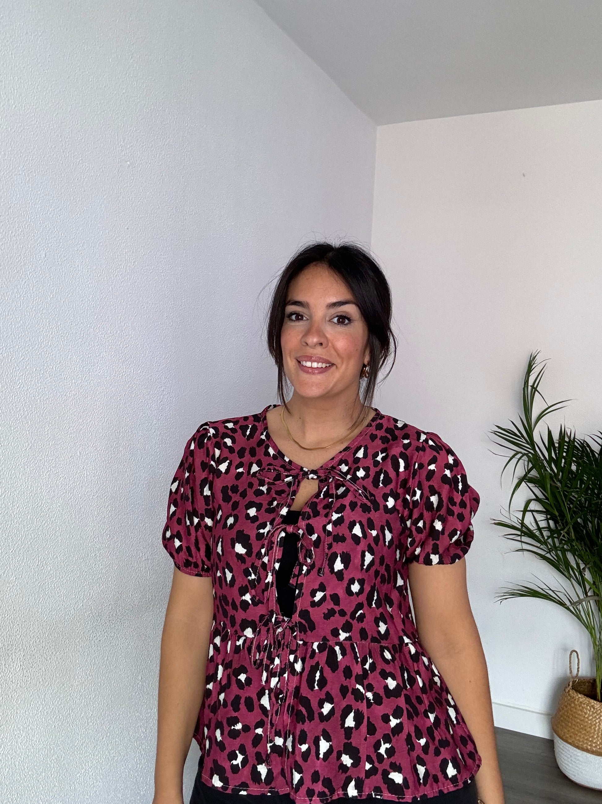 Blusa animal print con manga corta de farol y lazadas delanteras