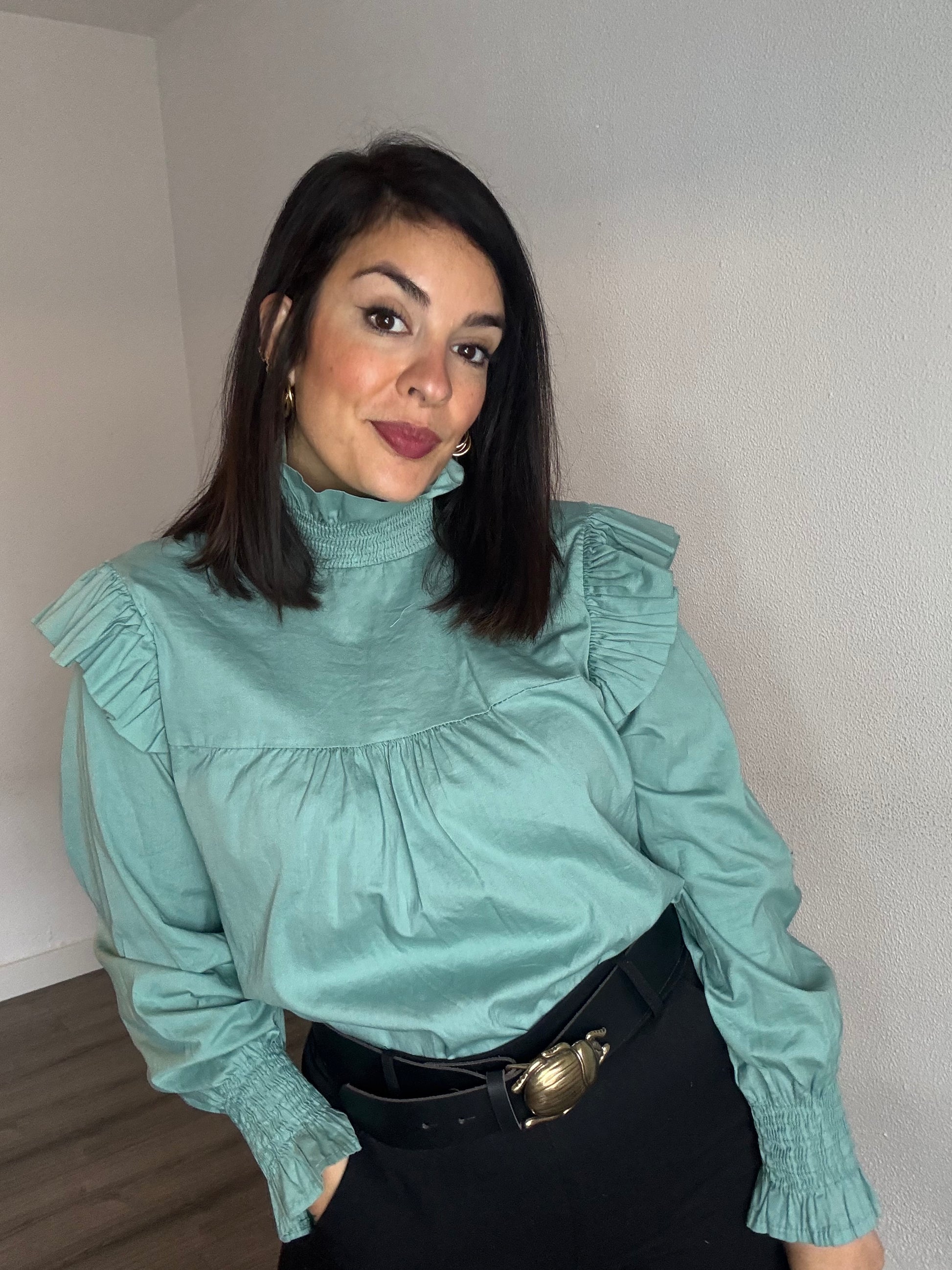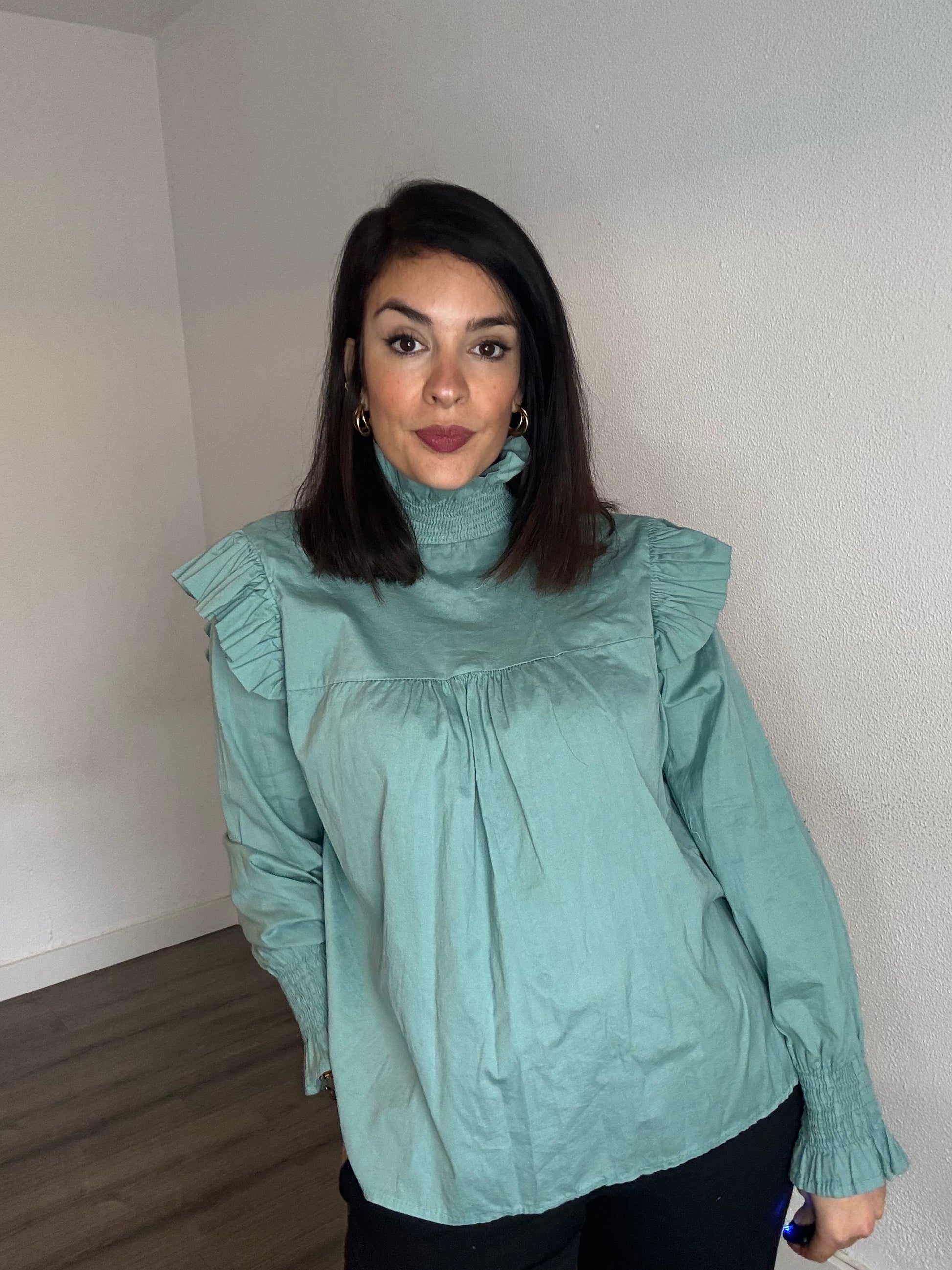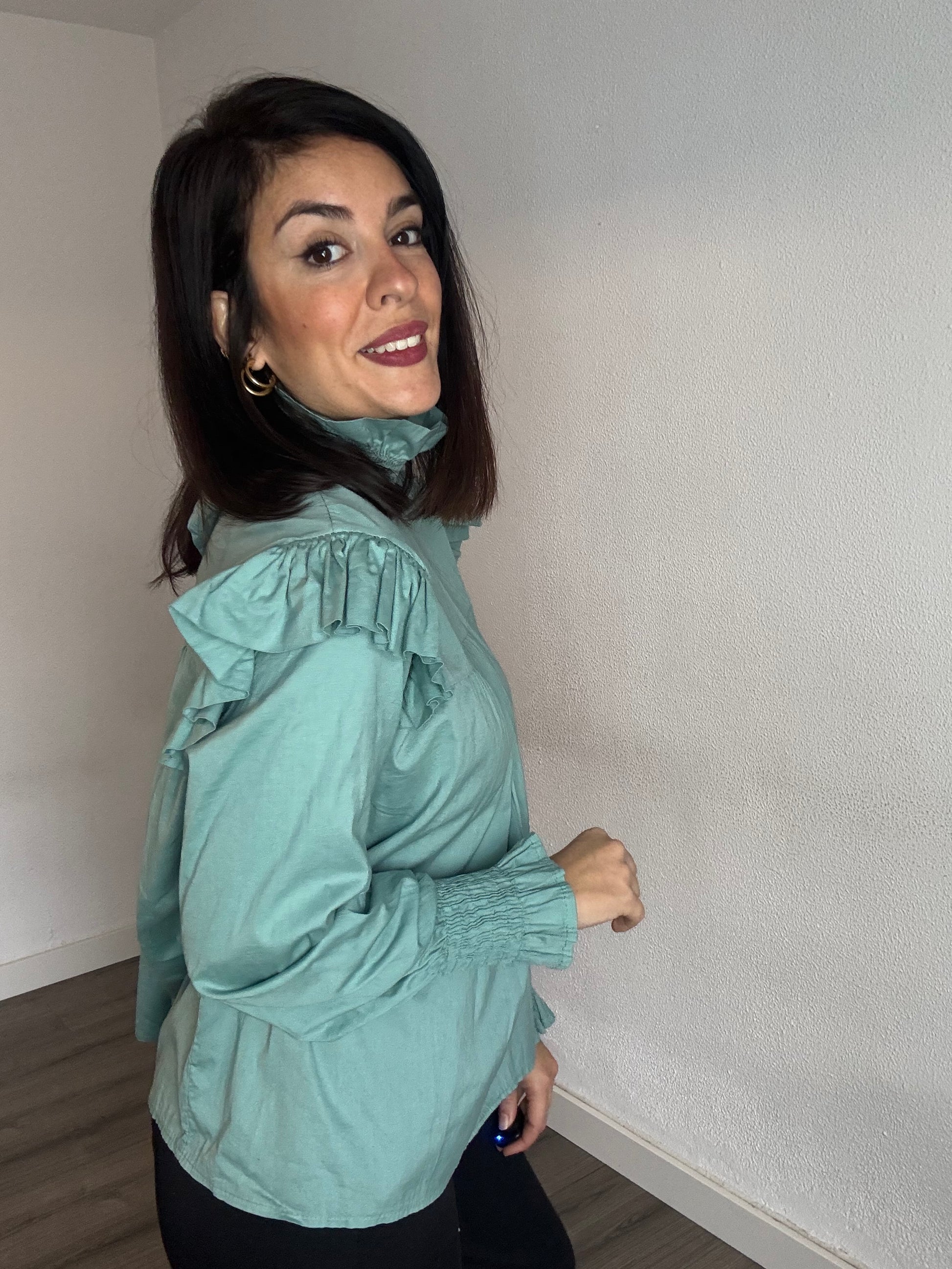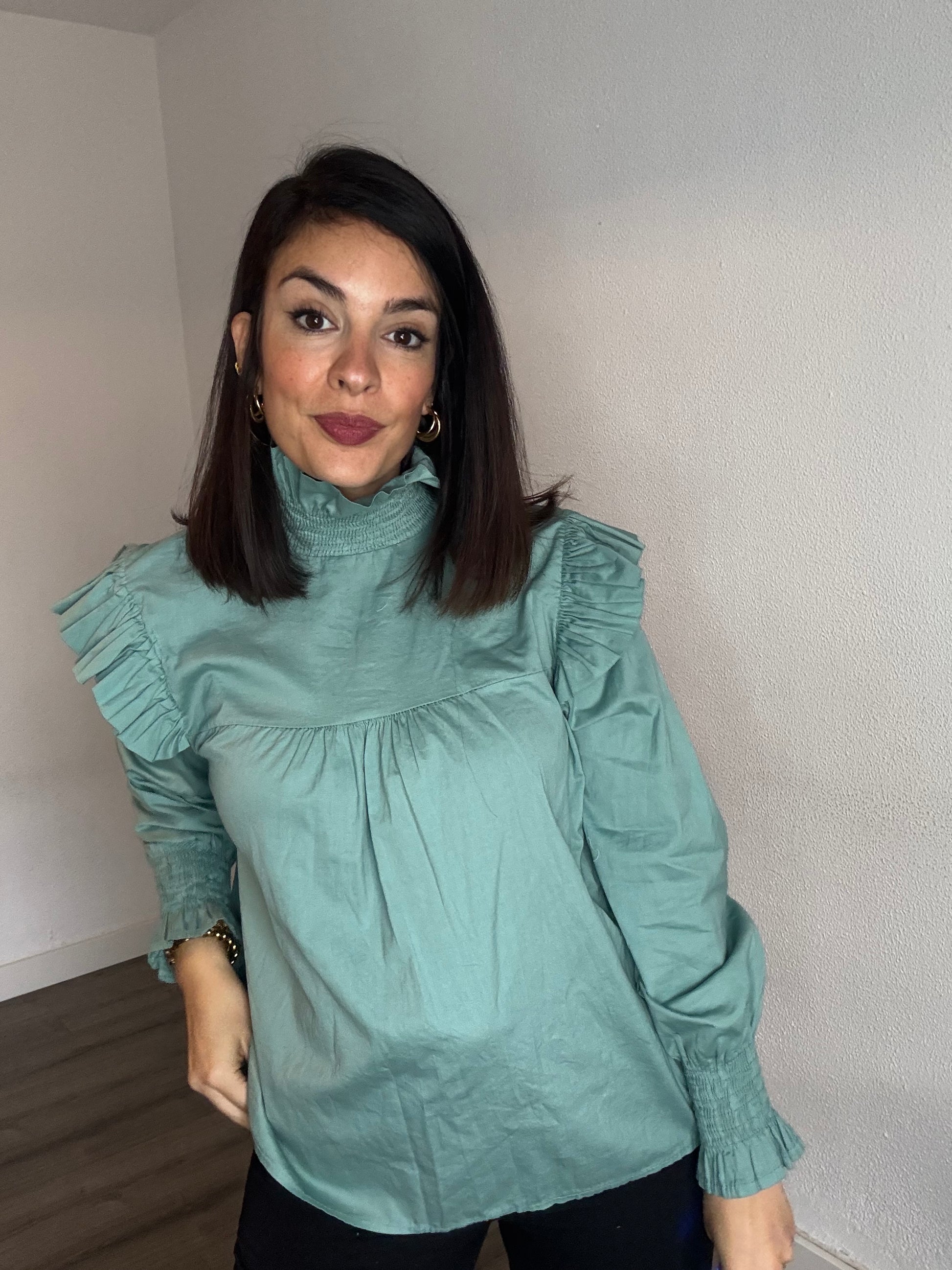 Blusa con corte encima del pecho cuello subido y adorno de volantes en los hombros.