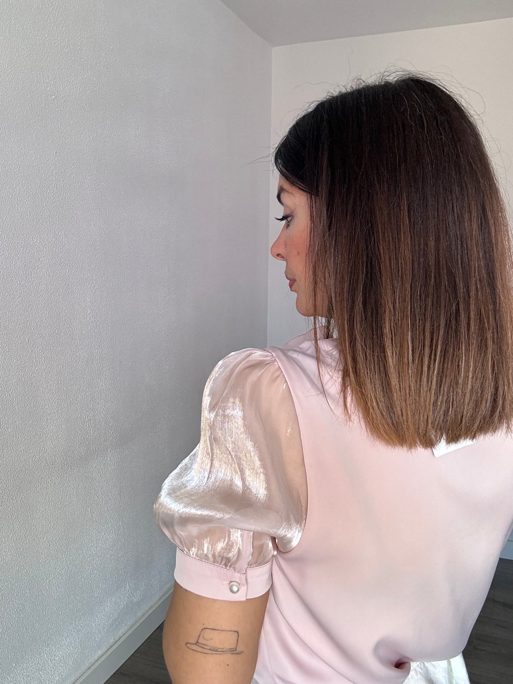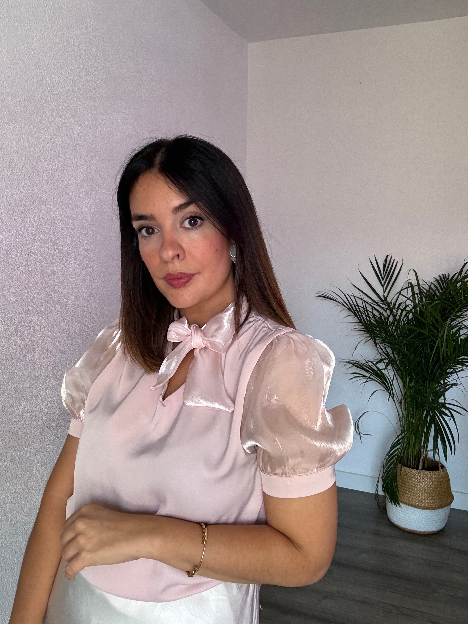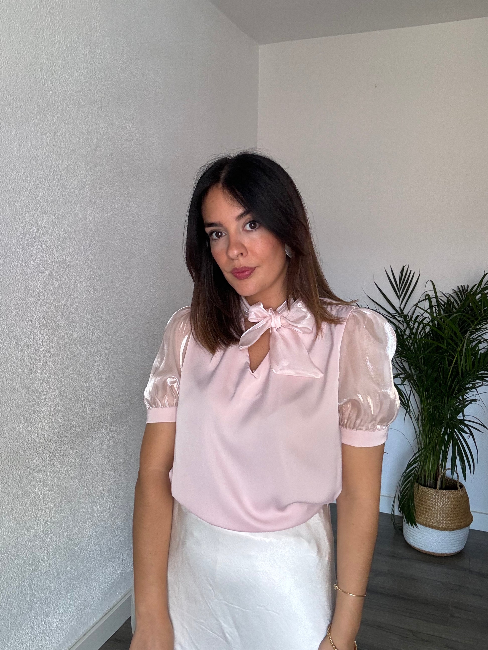 Blusa de manga corta, transparente y en forma de farolillo y escote en pico con una preciosa lazada.