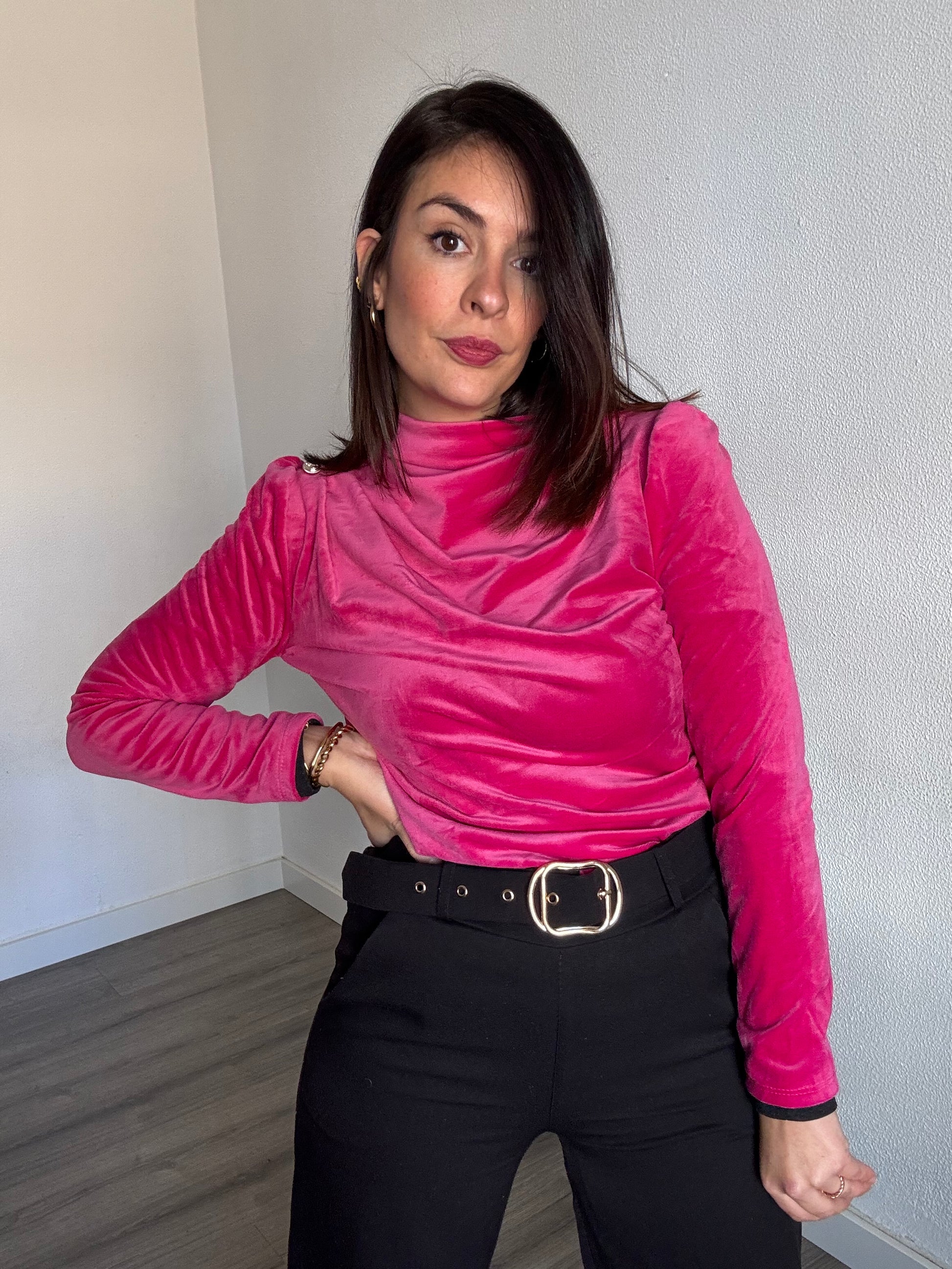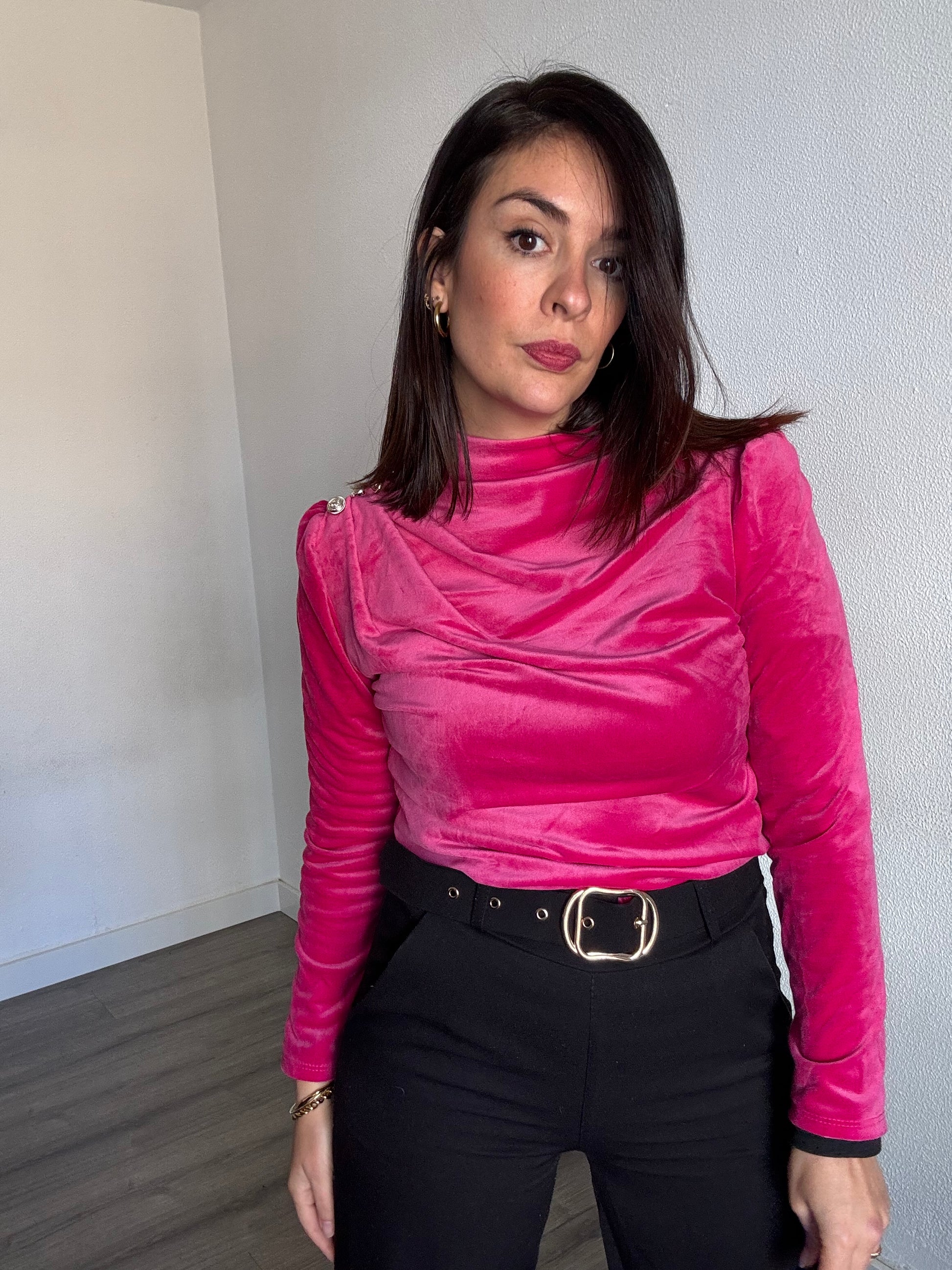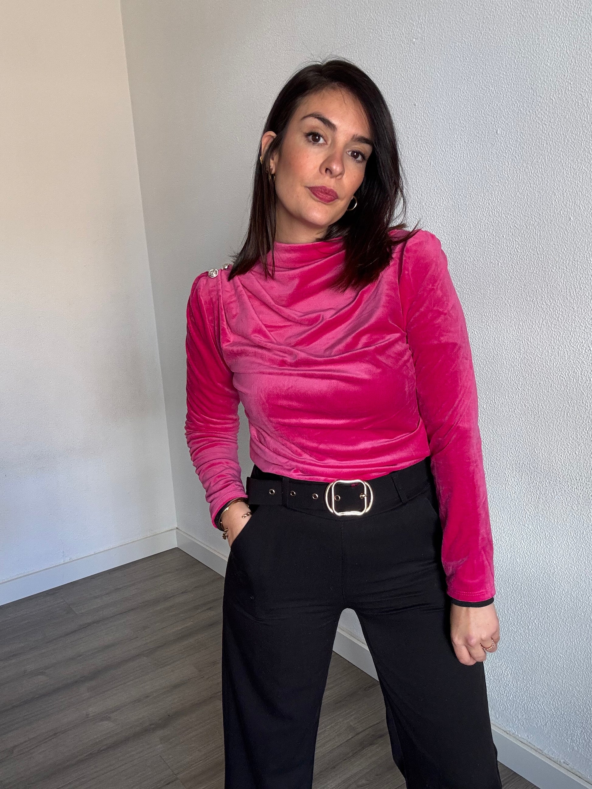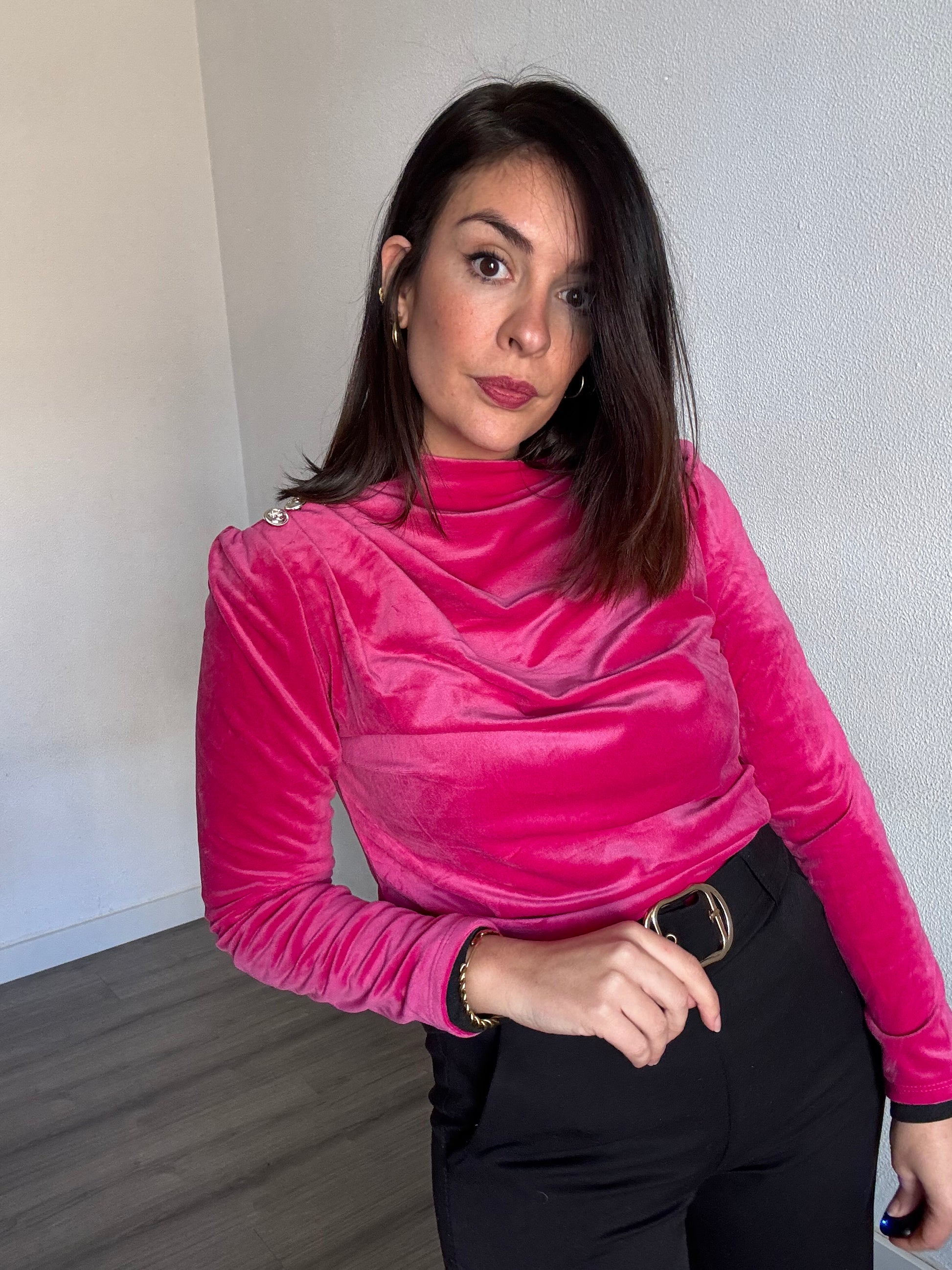 Blusa de terciopelo con cuello asimétrico y detalle de botones en uno de los hombros