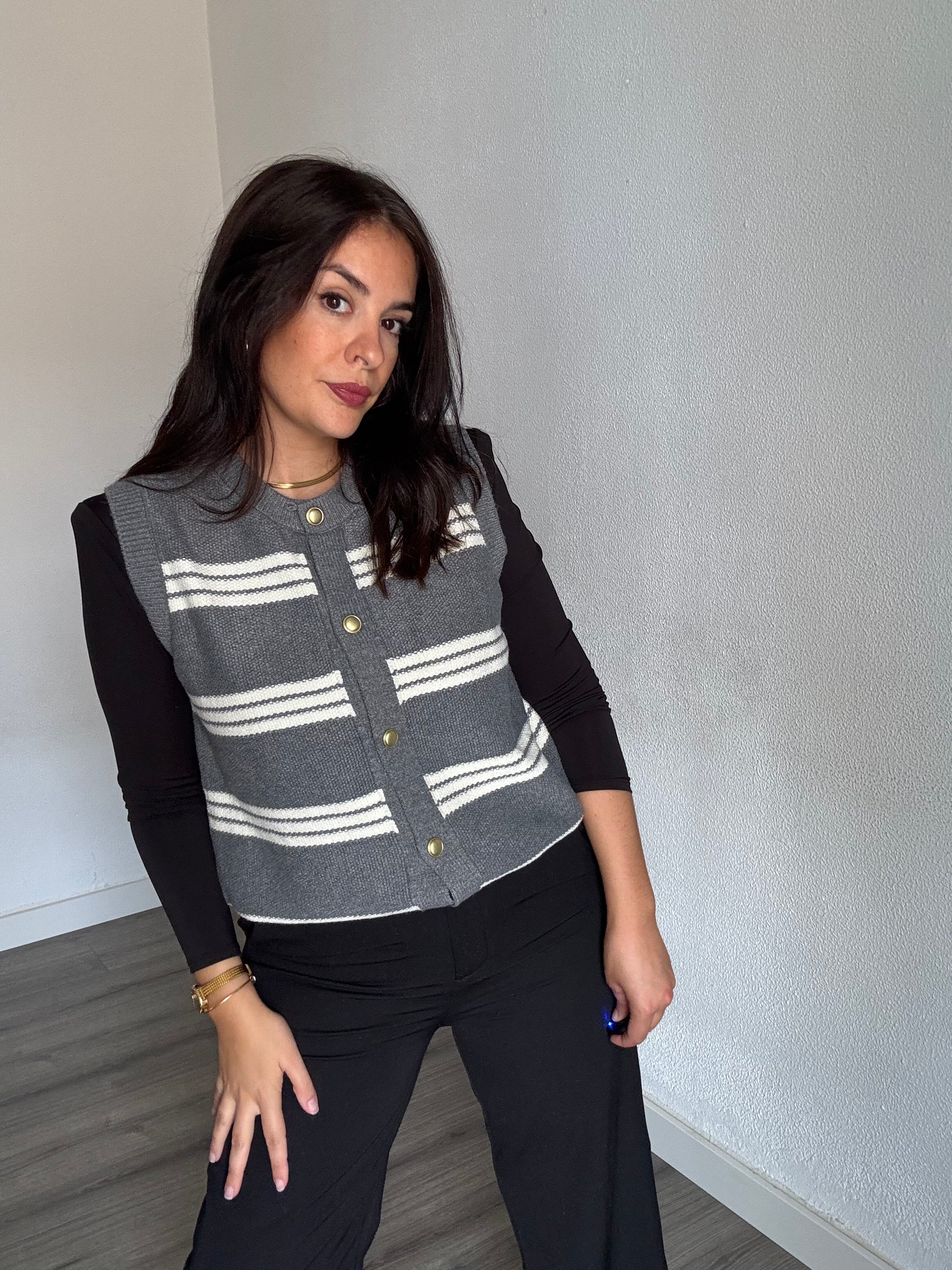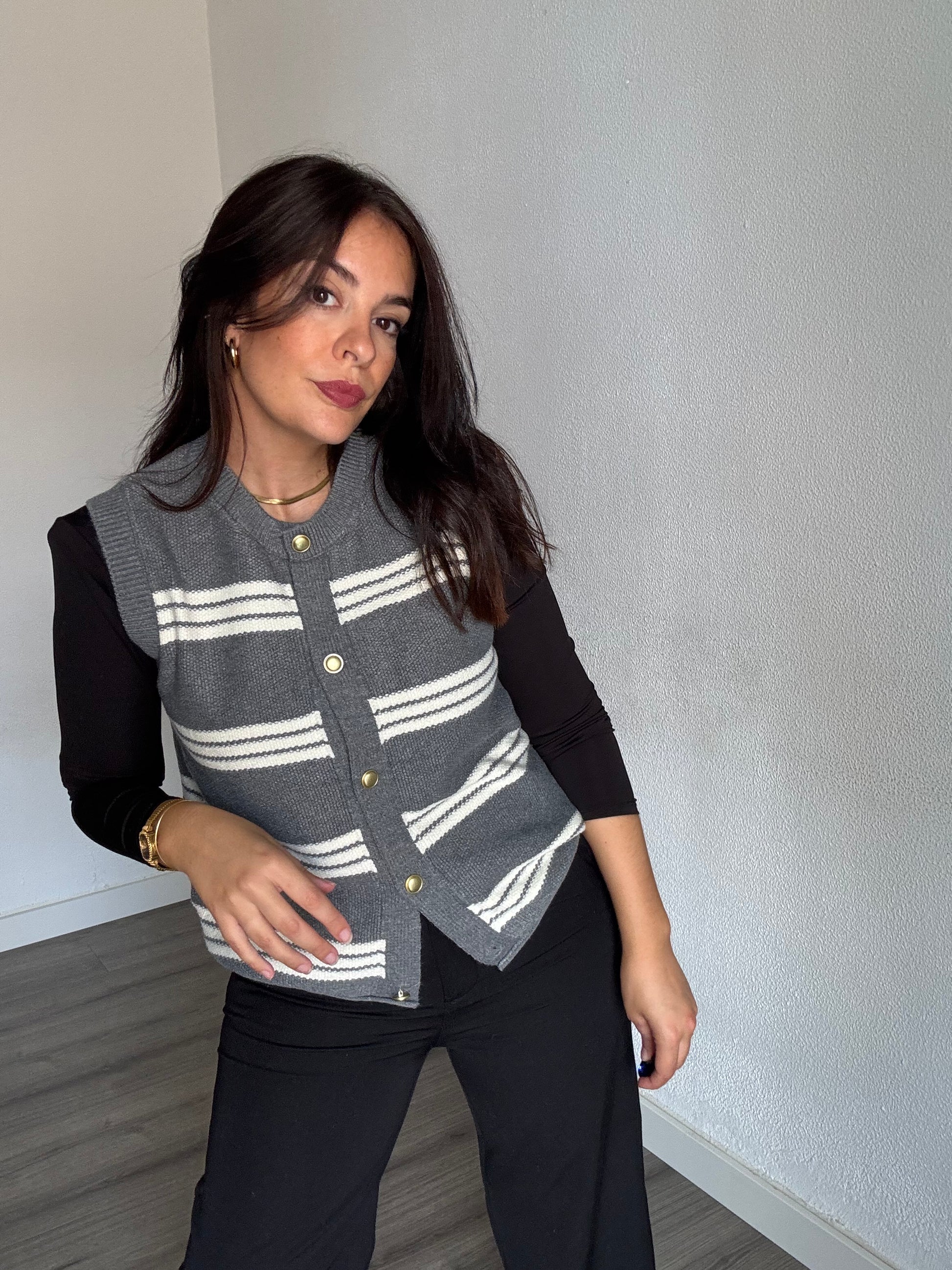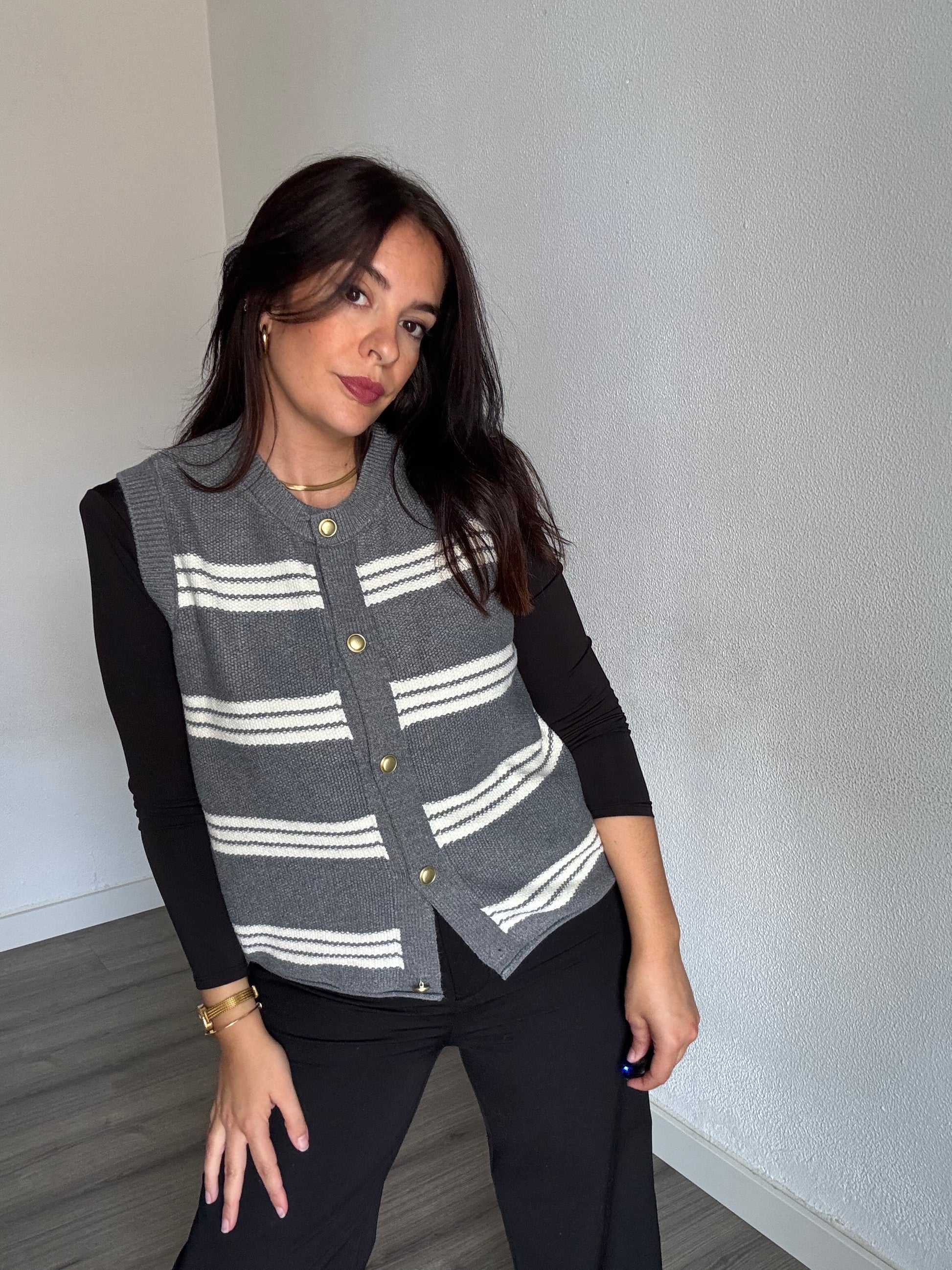 Cárdigan sin mangas, con botones dorados y cuello redondo.