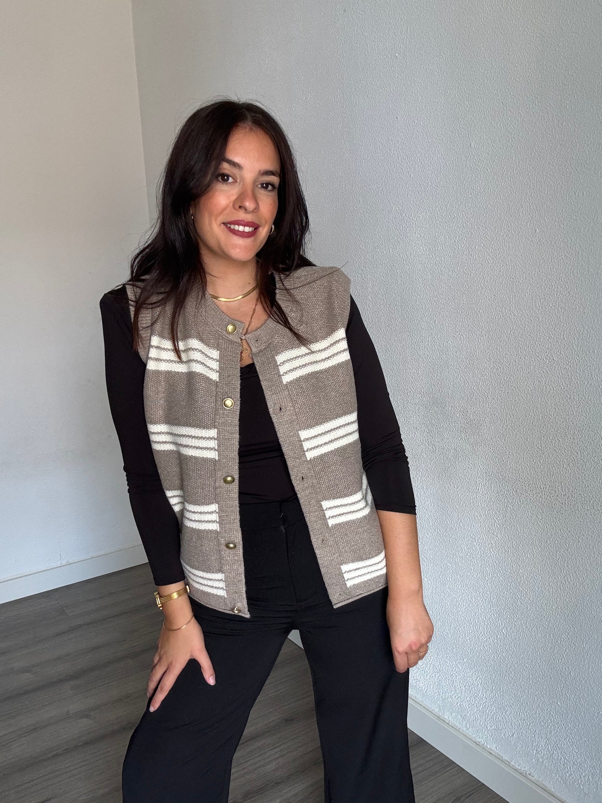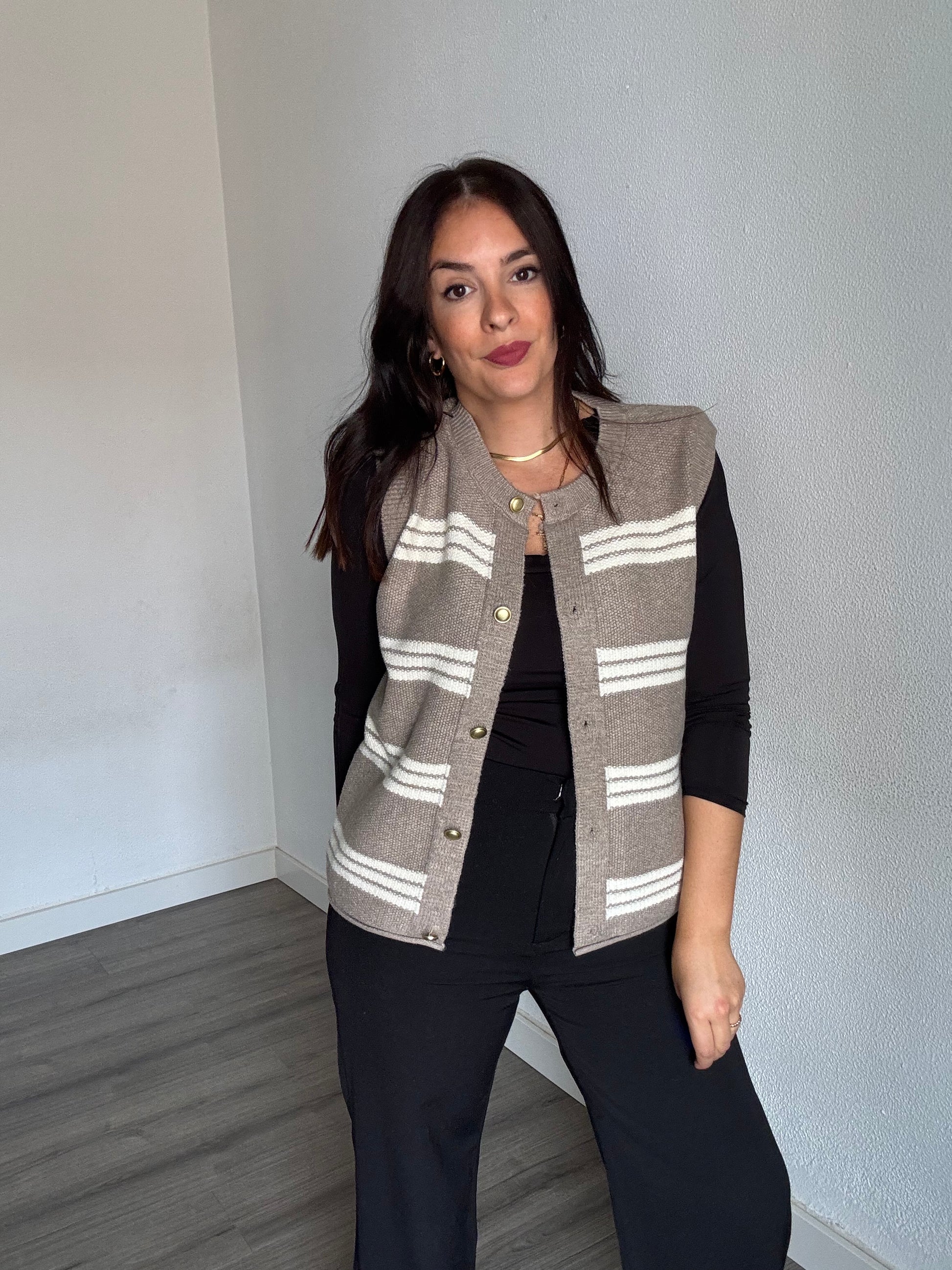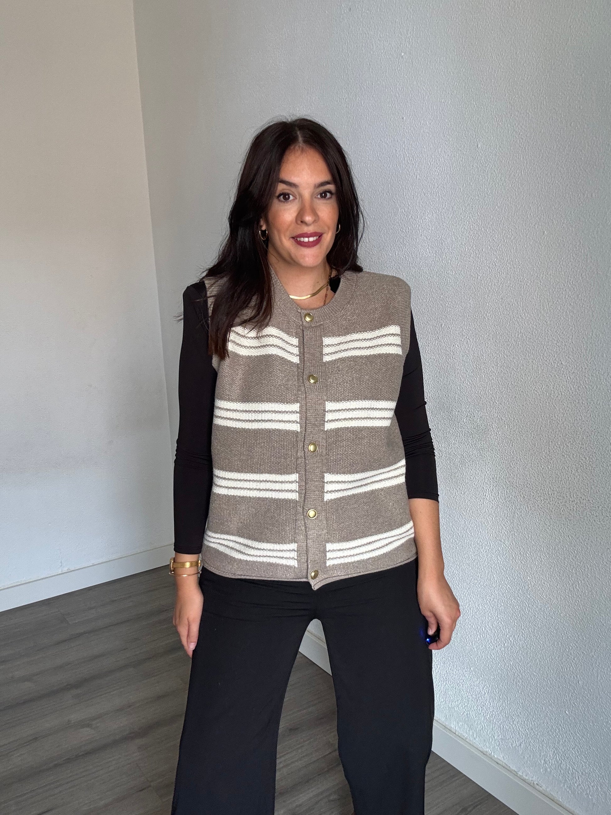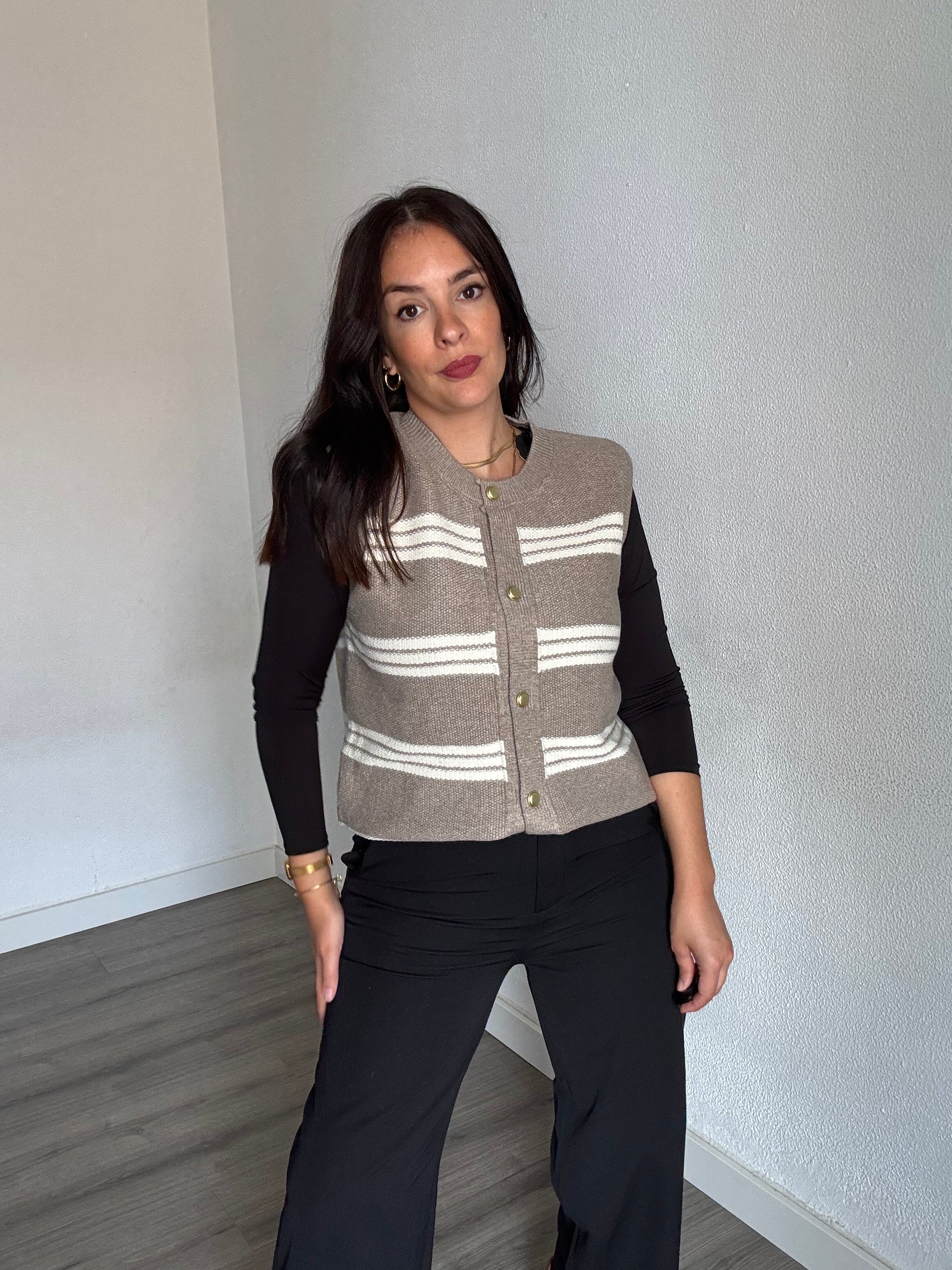 Cárdigan sin mangas, con botones dorados y cuello redondo.