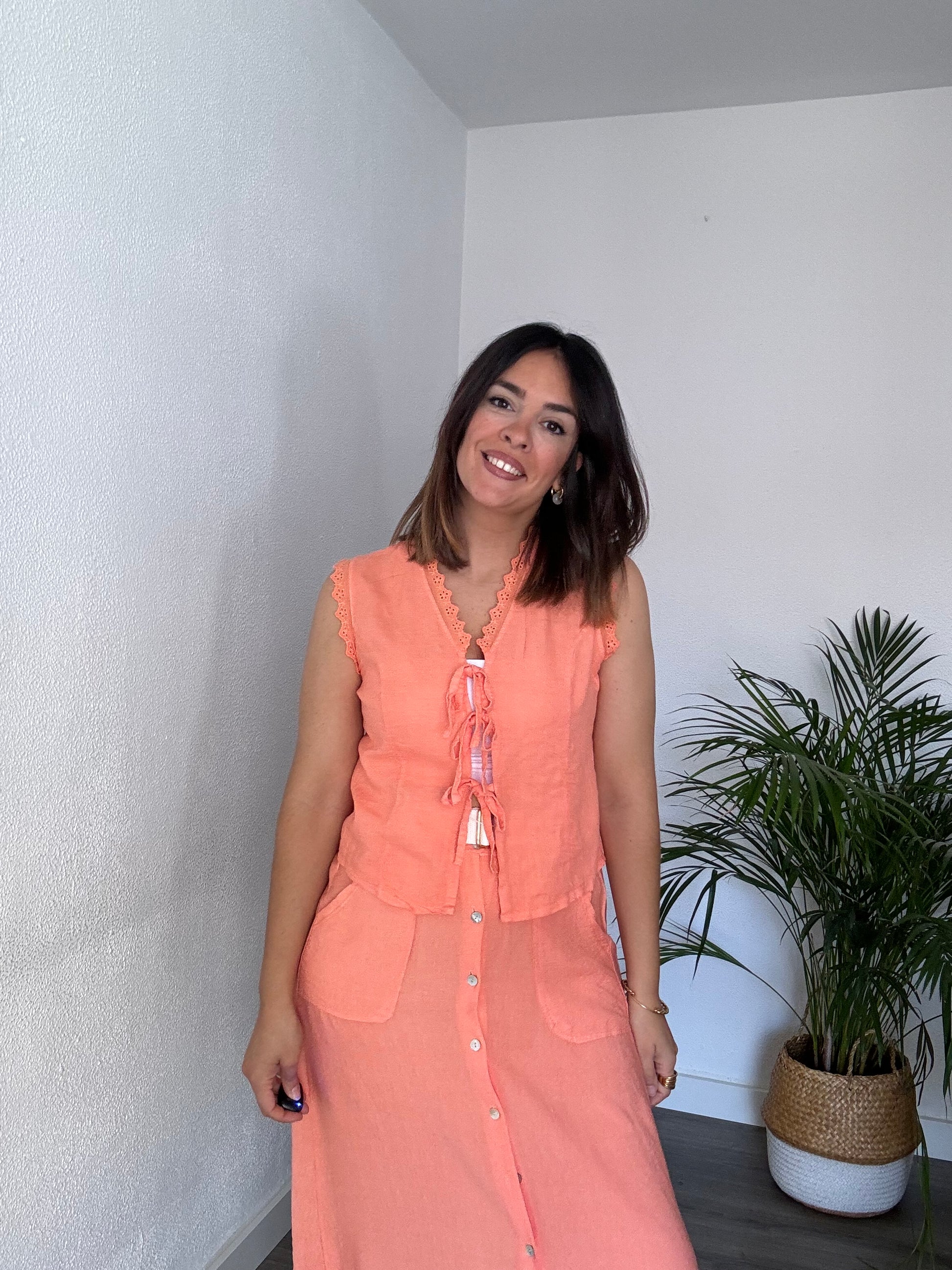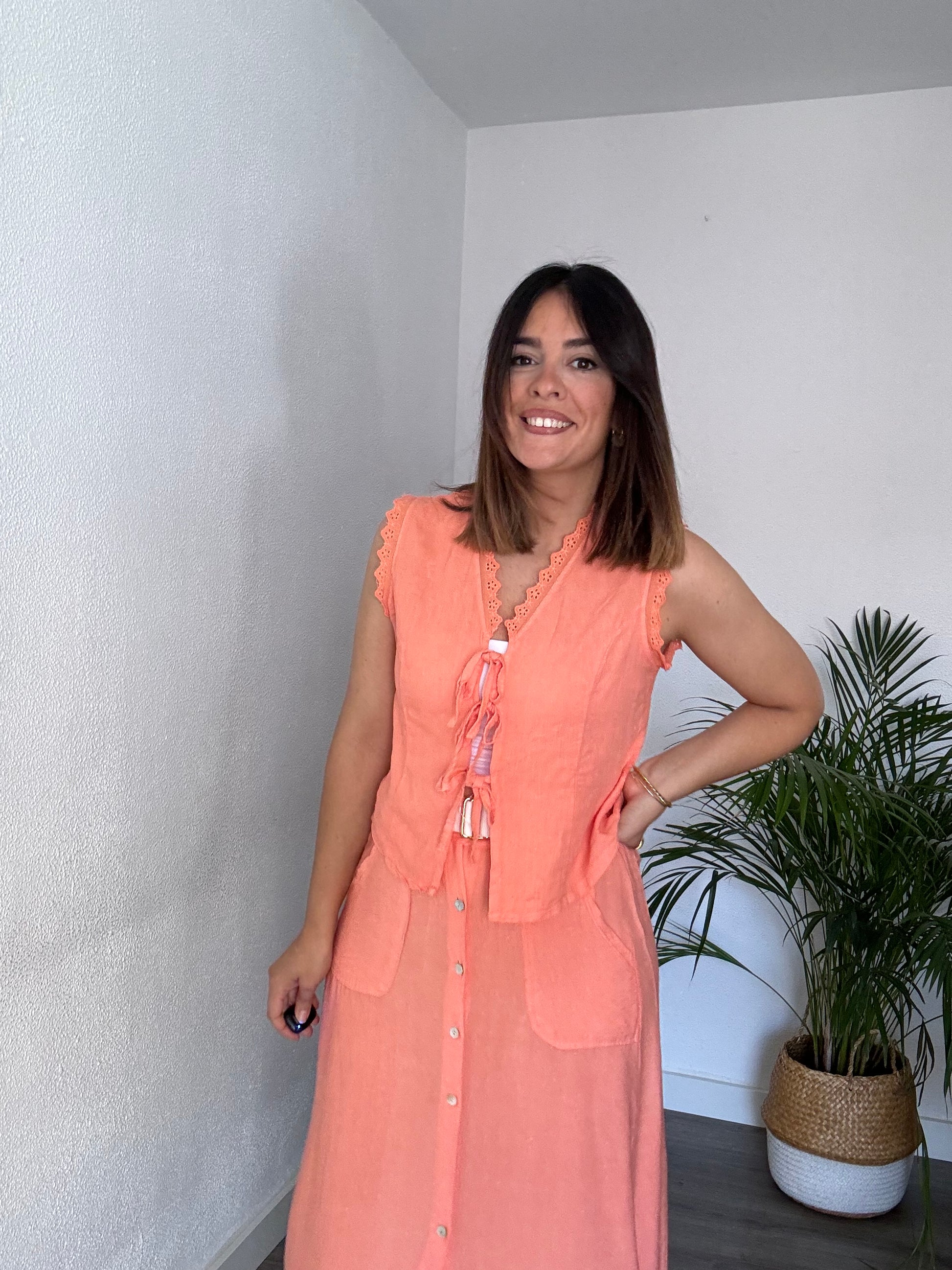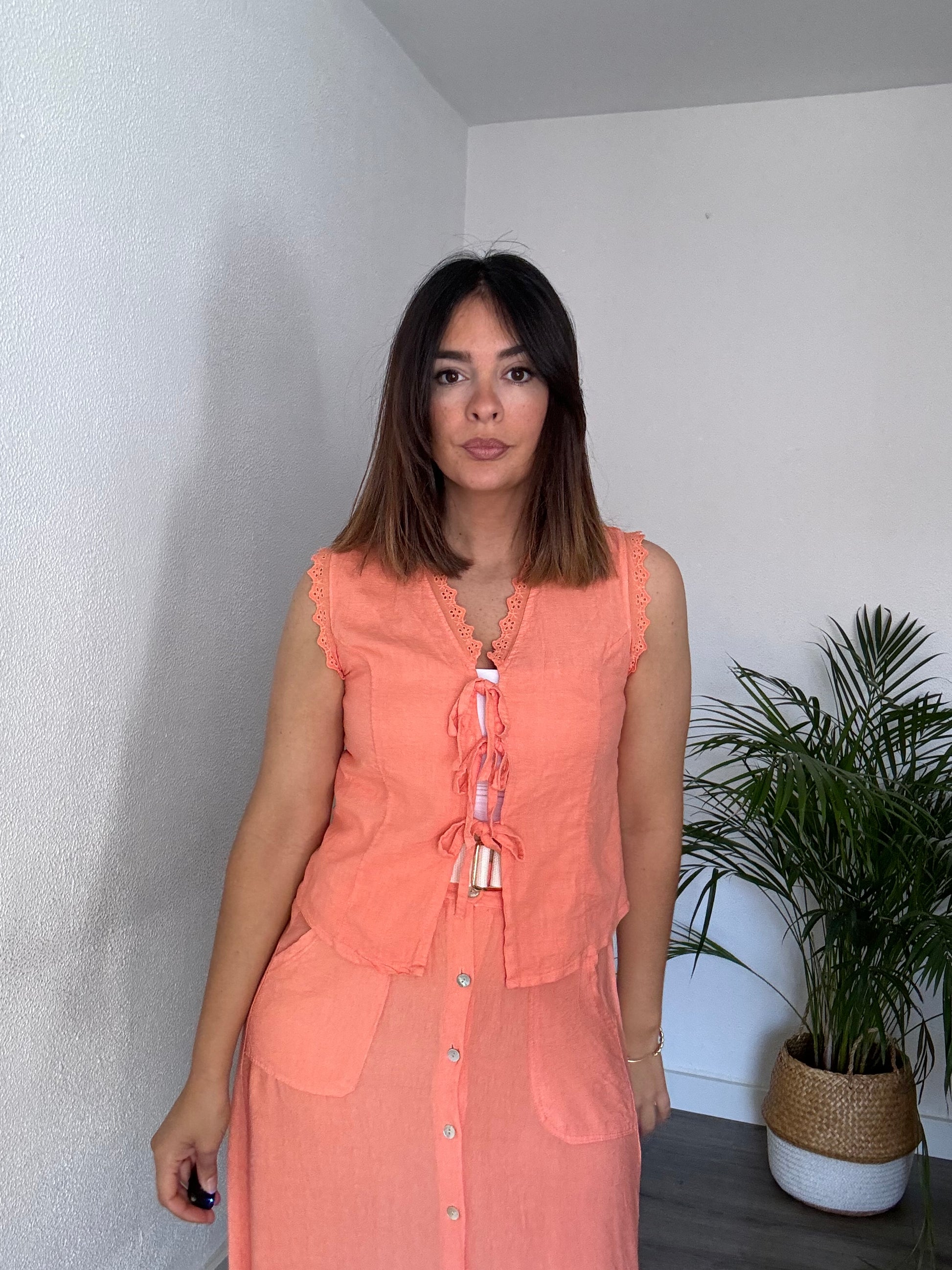 Chalequillo de hilo con tres lazadas delanteras y filo de encaje.
