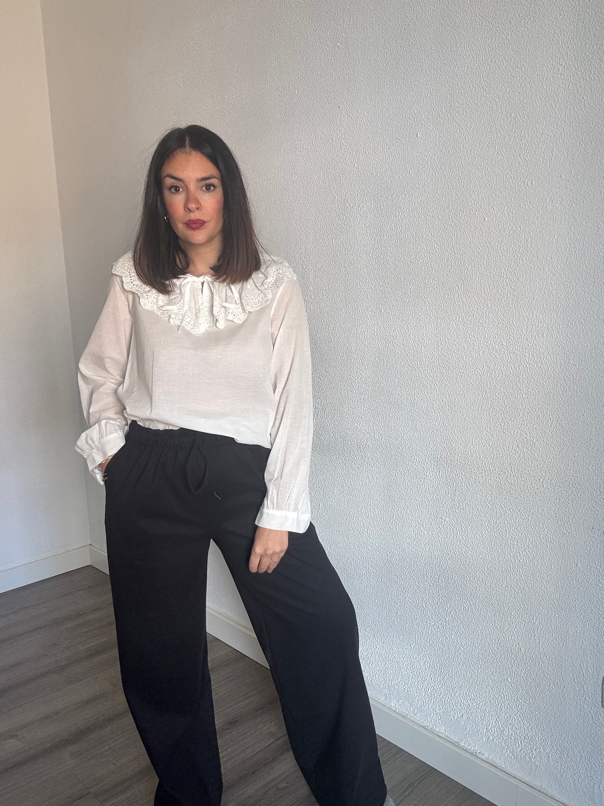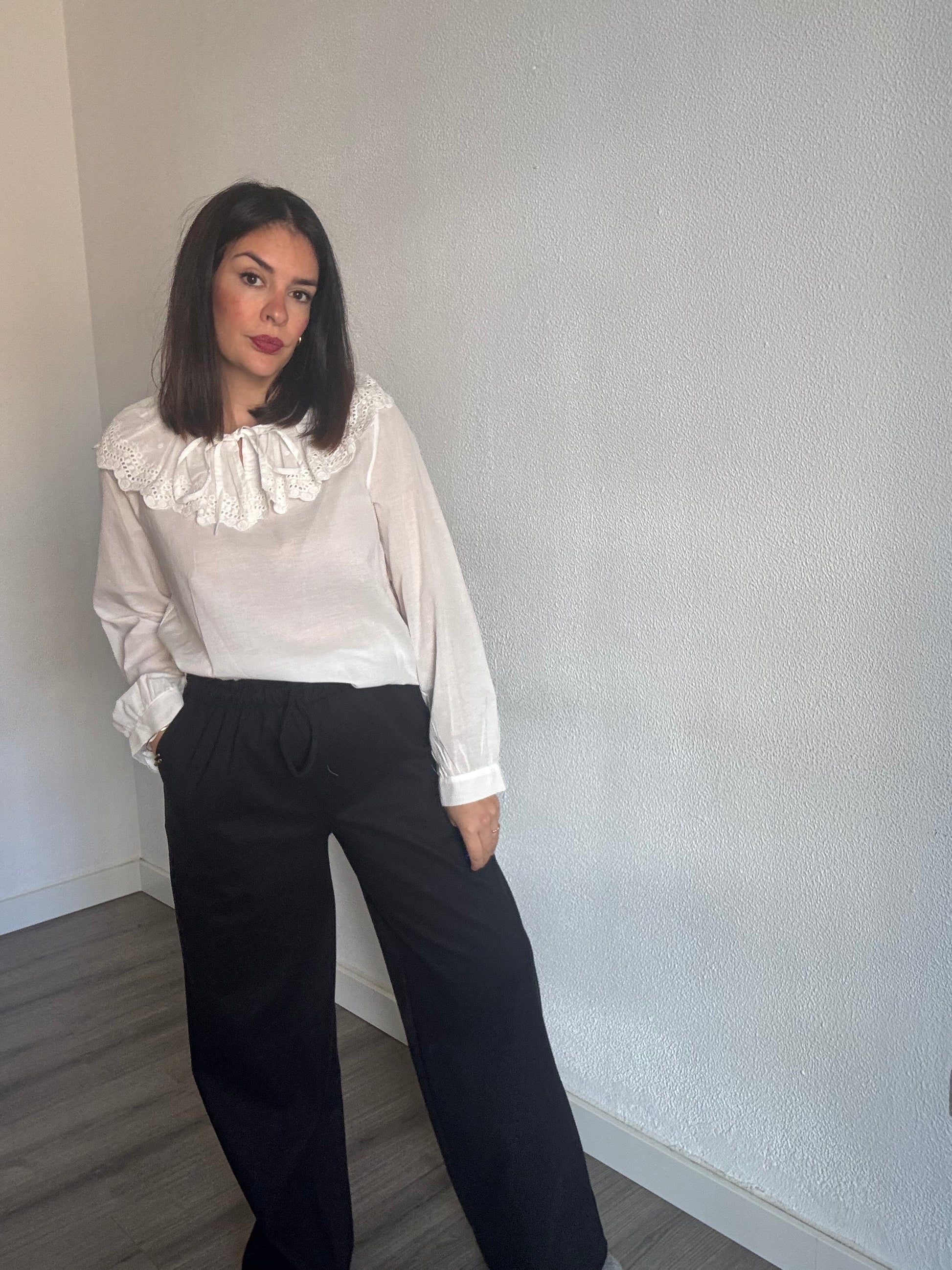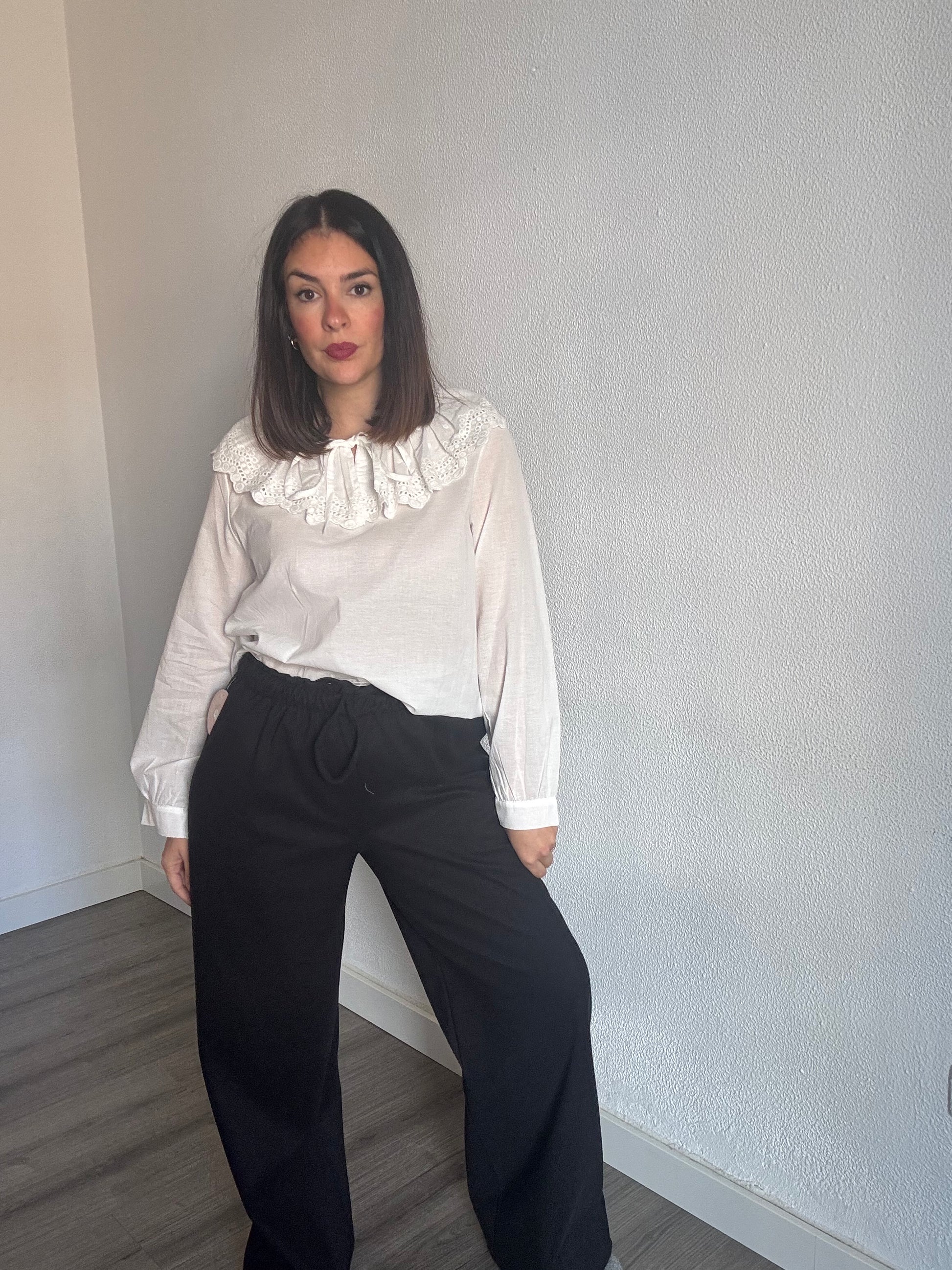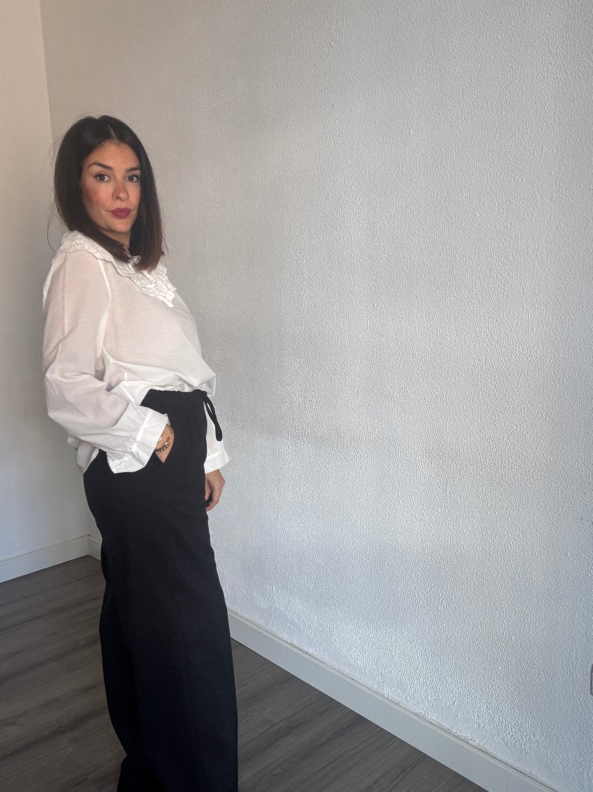Pantalón con tela gordita y pata de elefante, su cinturilla es elástica y viene con cordon.