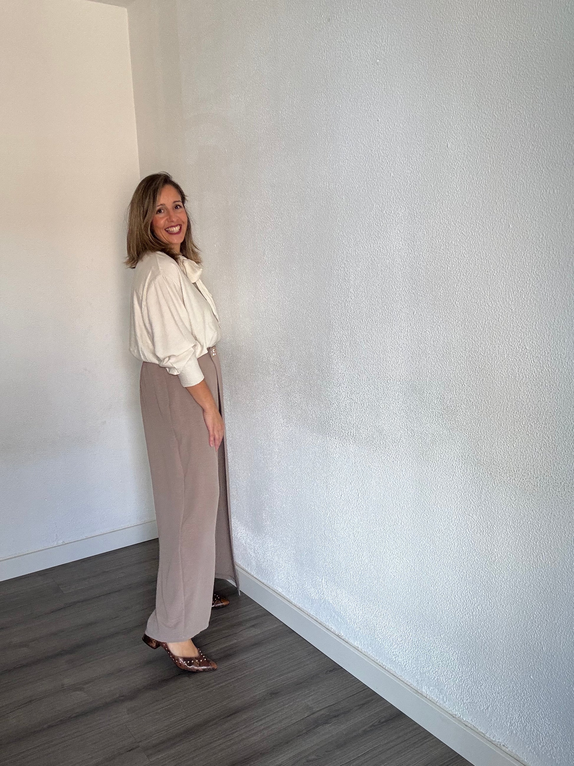 Pantalón con cruce delantero y botones joya, su cinturilla es elástica. Talla curvy