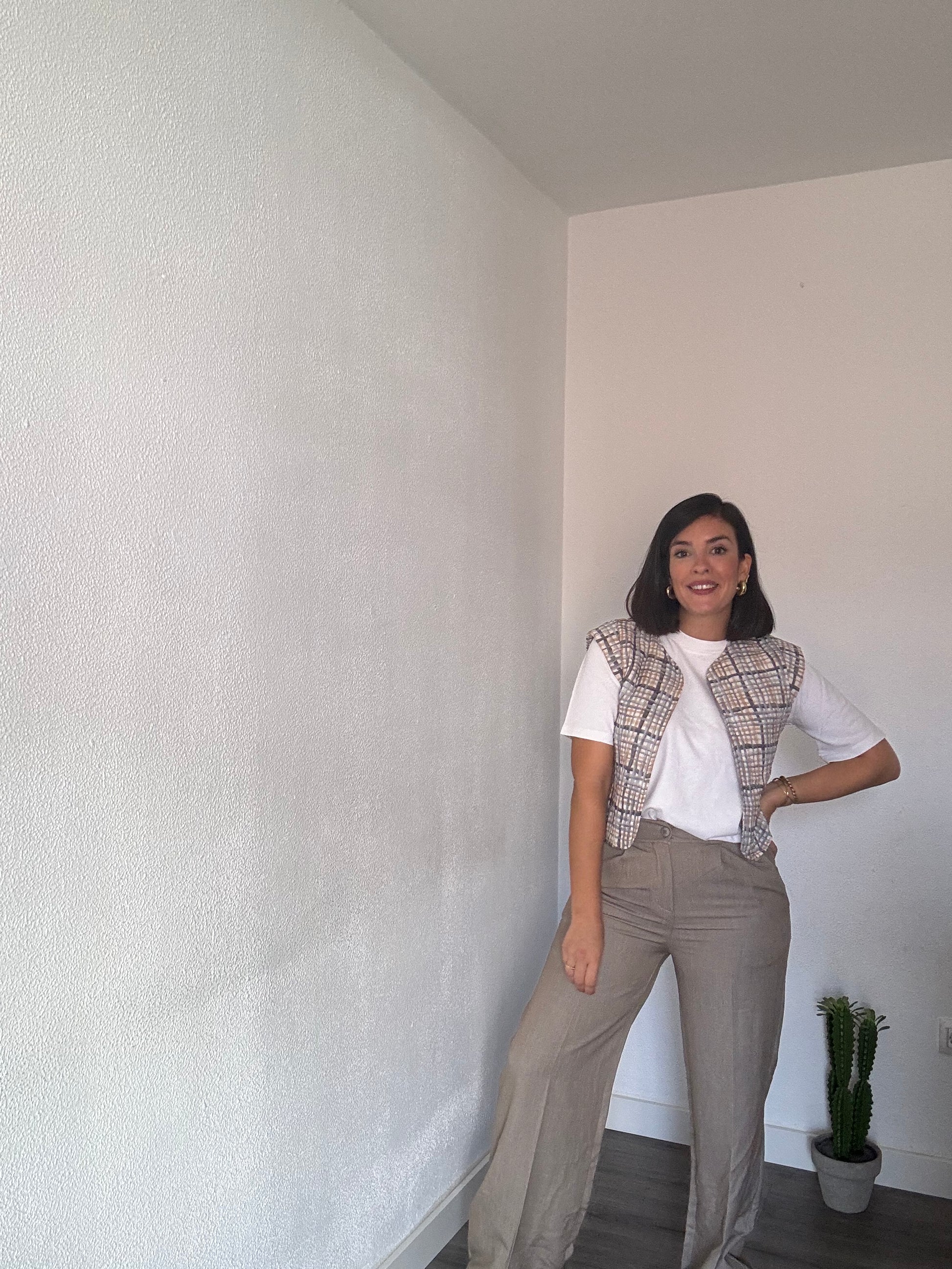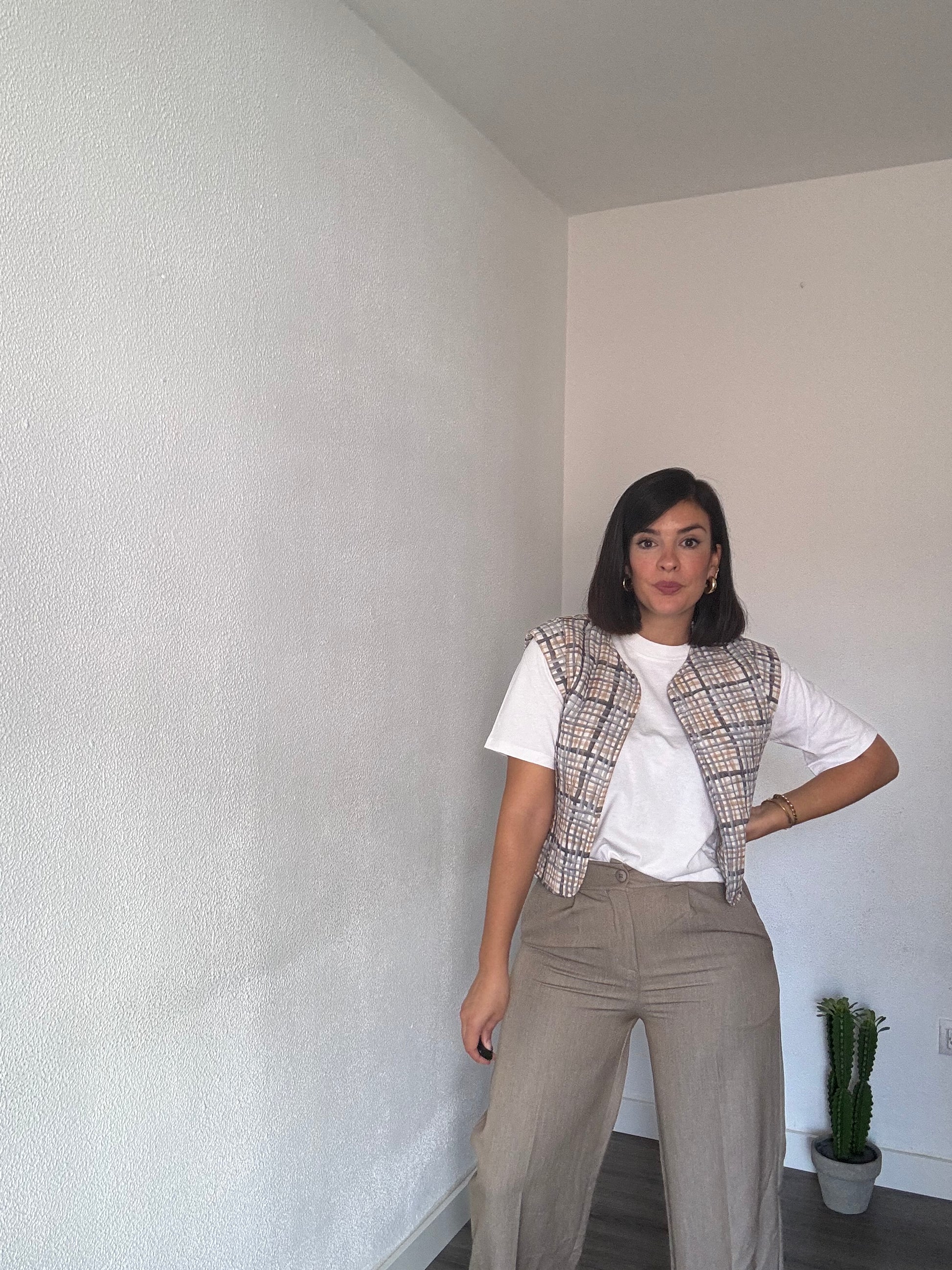 Pantalón de pinzas con pata de elefante y cinturilla trasera elástica. Talla única que comprende las talla 36 y 38.