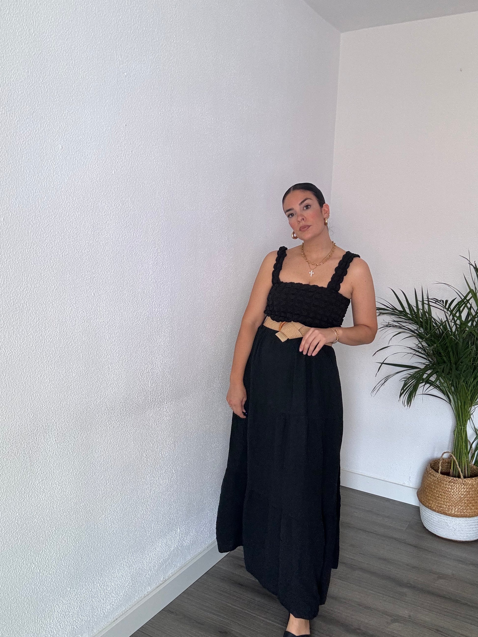Top con escote cuadrado y tirantes. Es un top pequeño y contiene cascos.