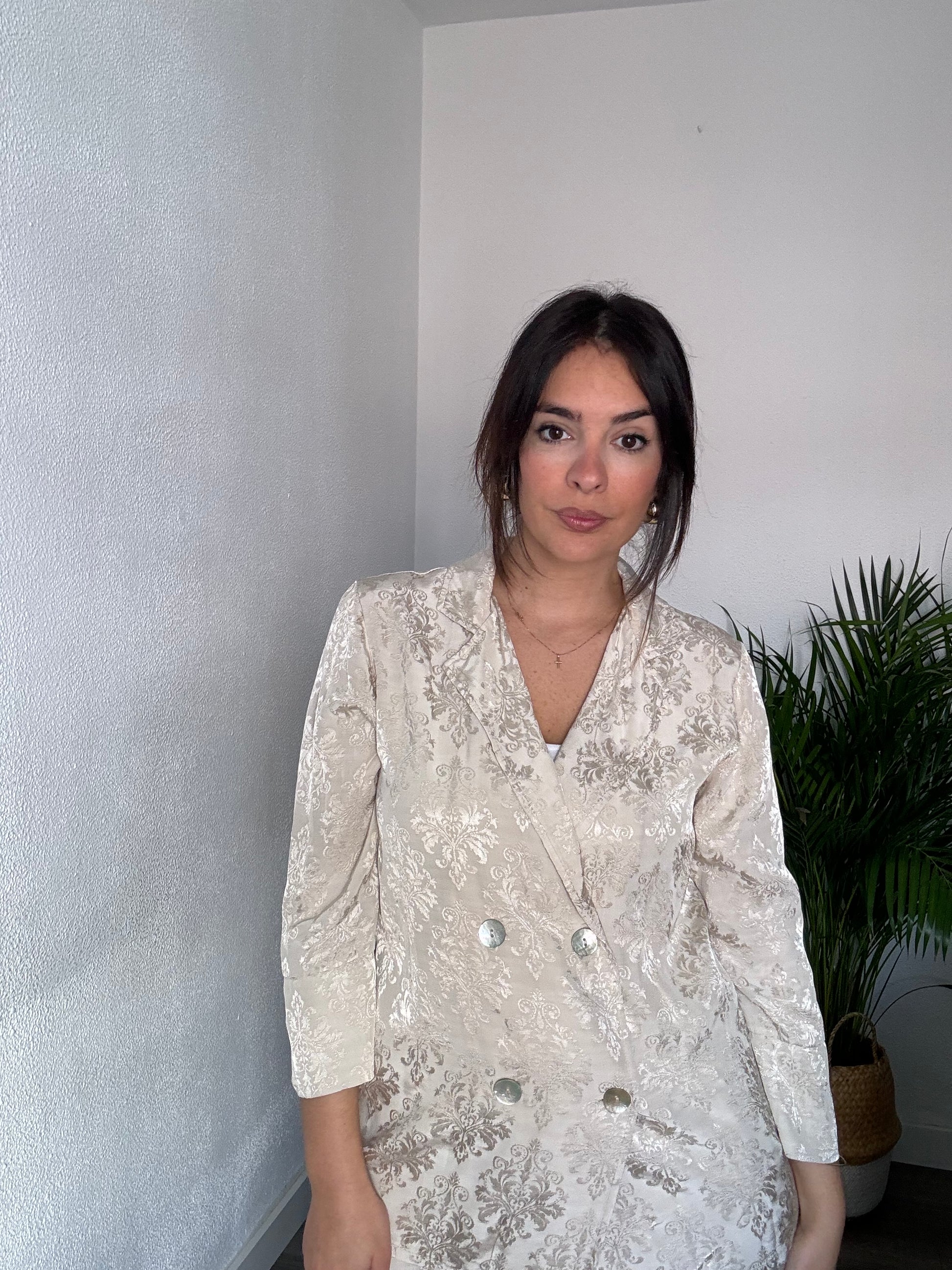 Traje de chaqueta de satén ,se compone de chaqueta cruzada con cuatro botones y pantalón de pata de elefante y cinturilla elástica