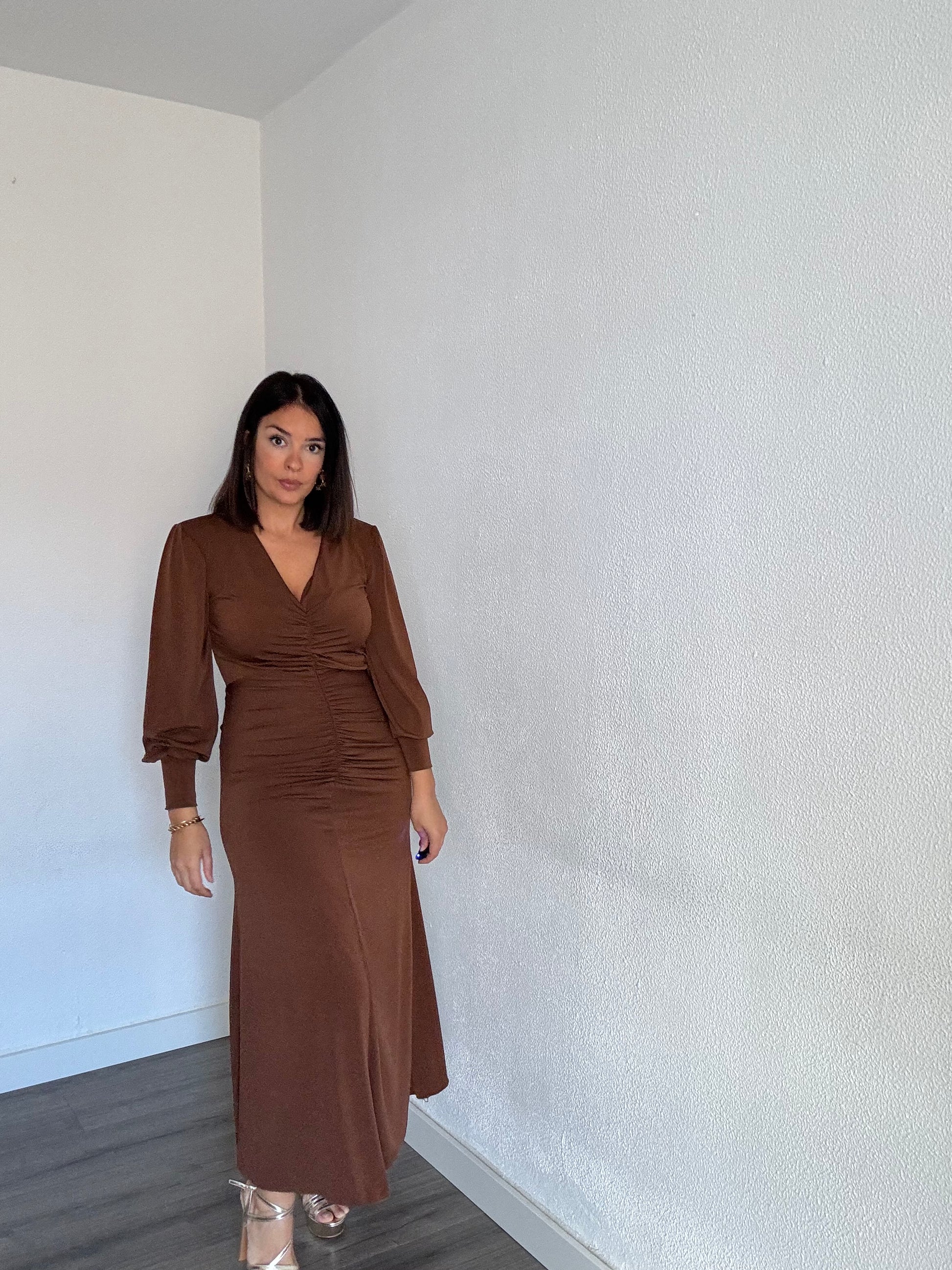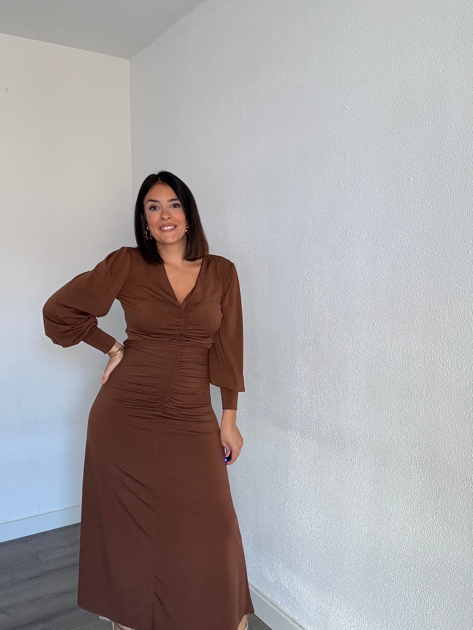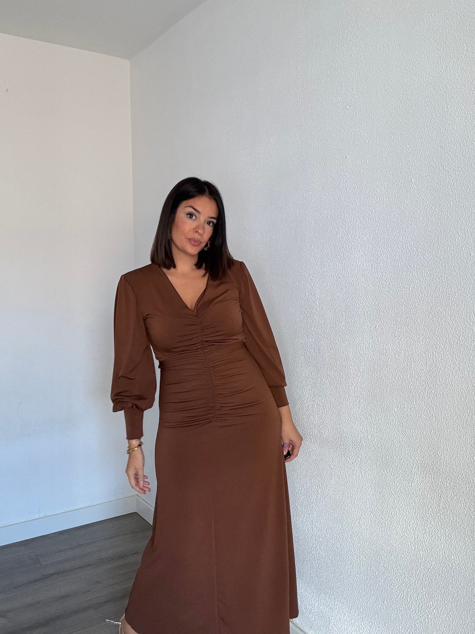 Vestido midi de licra con manga abullonada y escote en v, tiene drapeado delantero y trasero. Talla única
