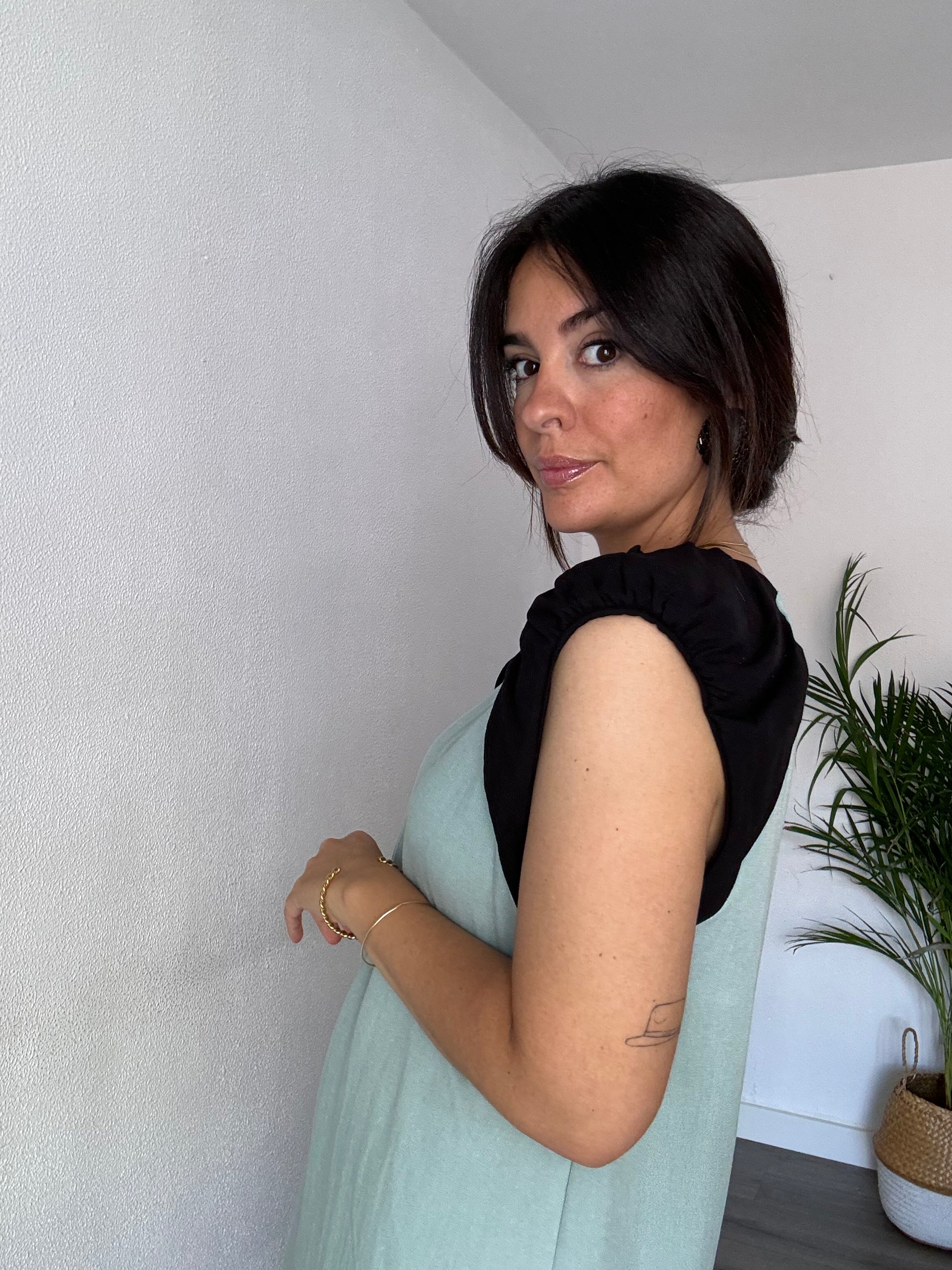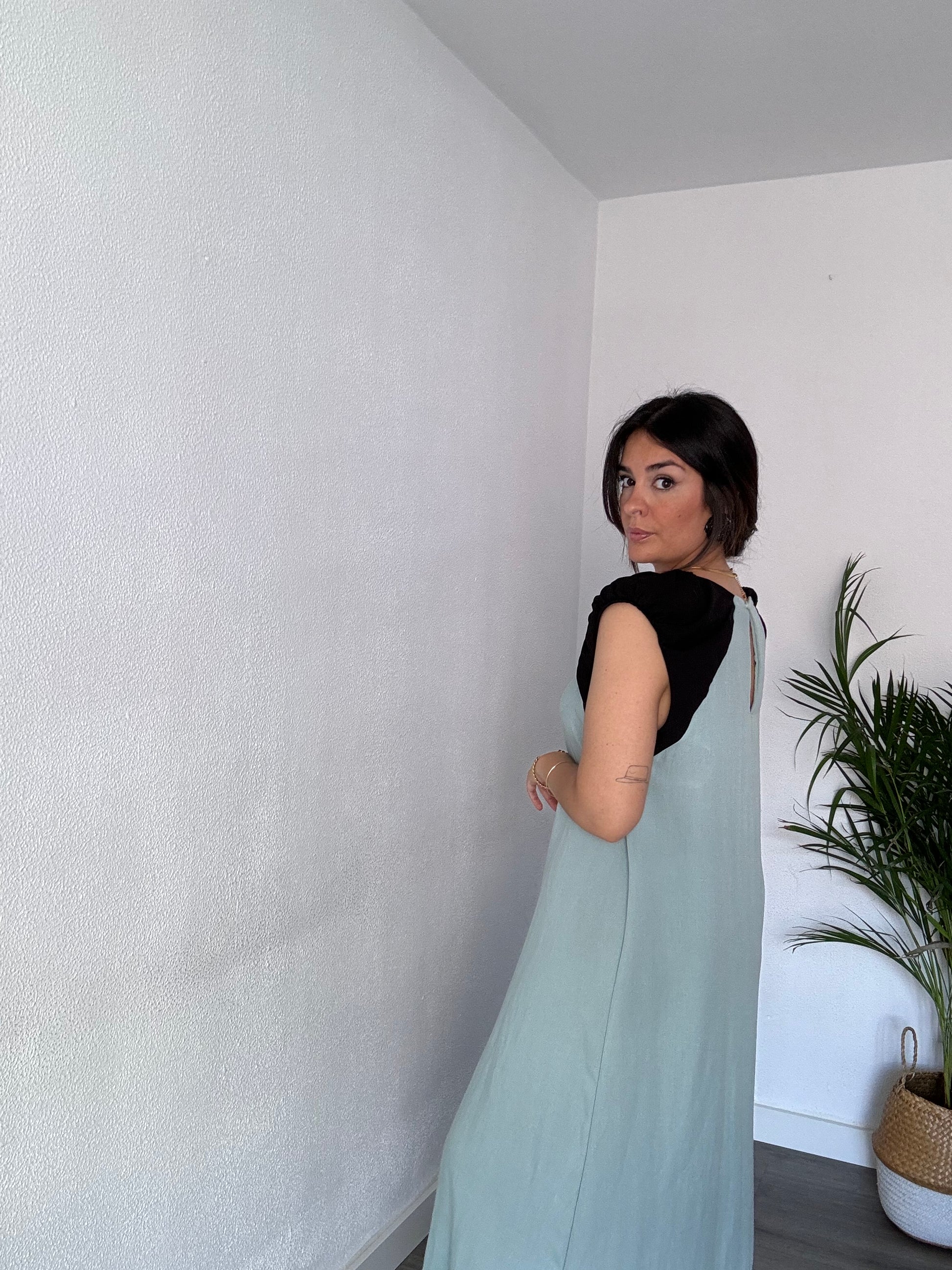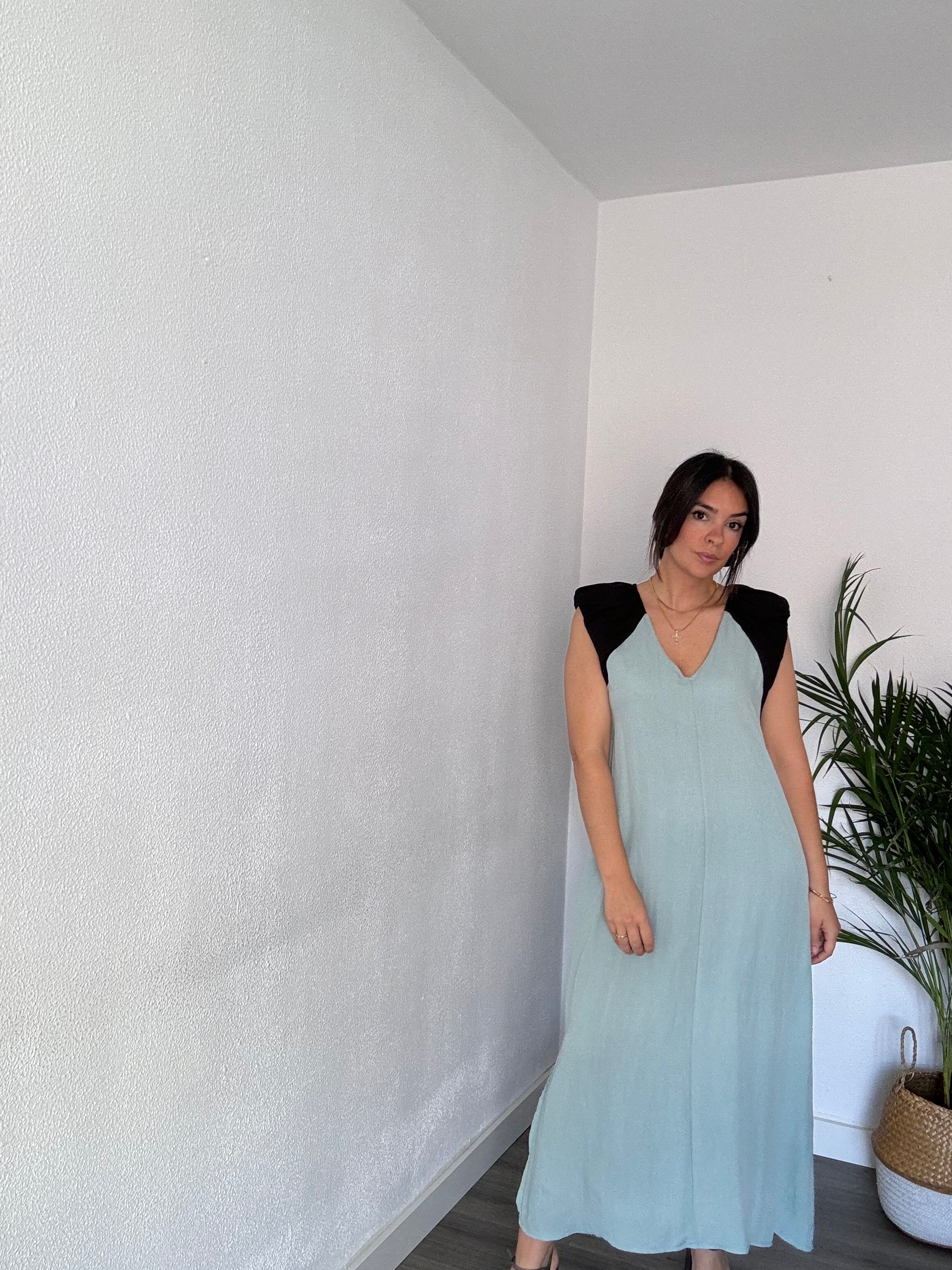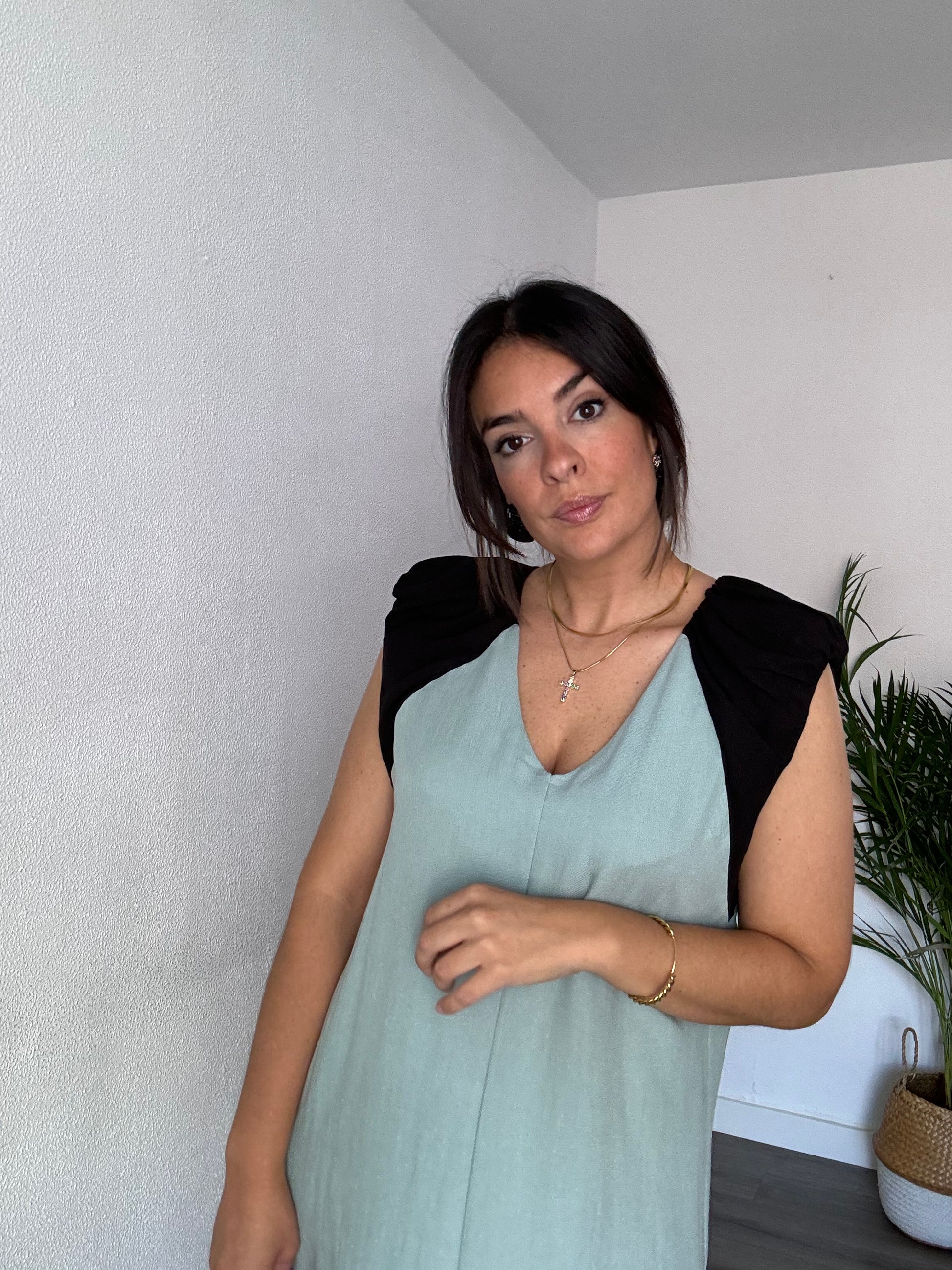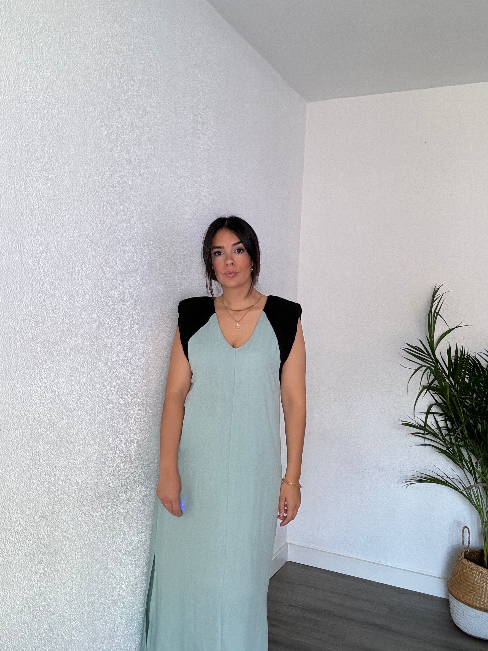 Vestido midi con hombreras y adorno drapeado en ellas, abertura lateral y escote en pico.