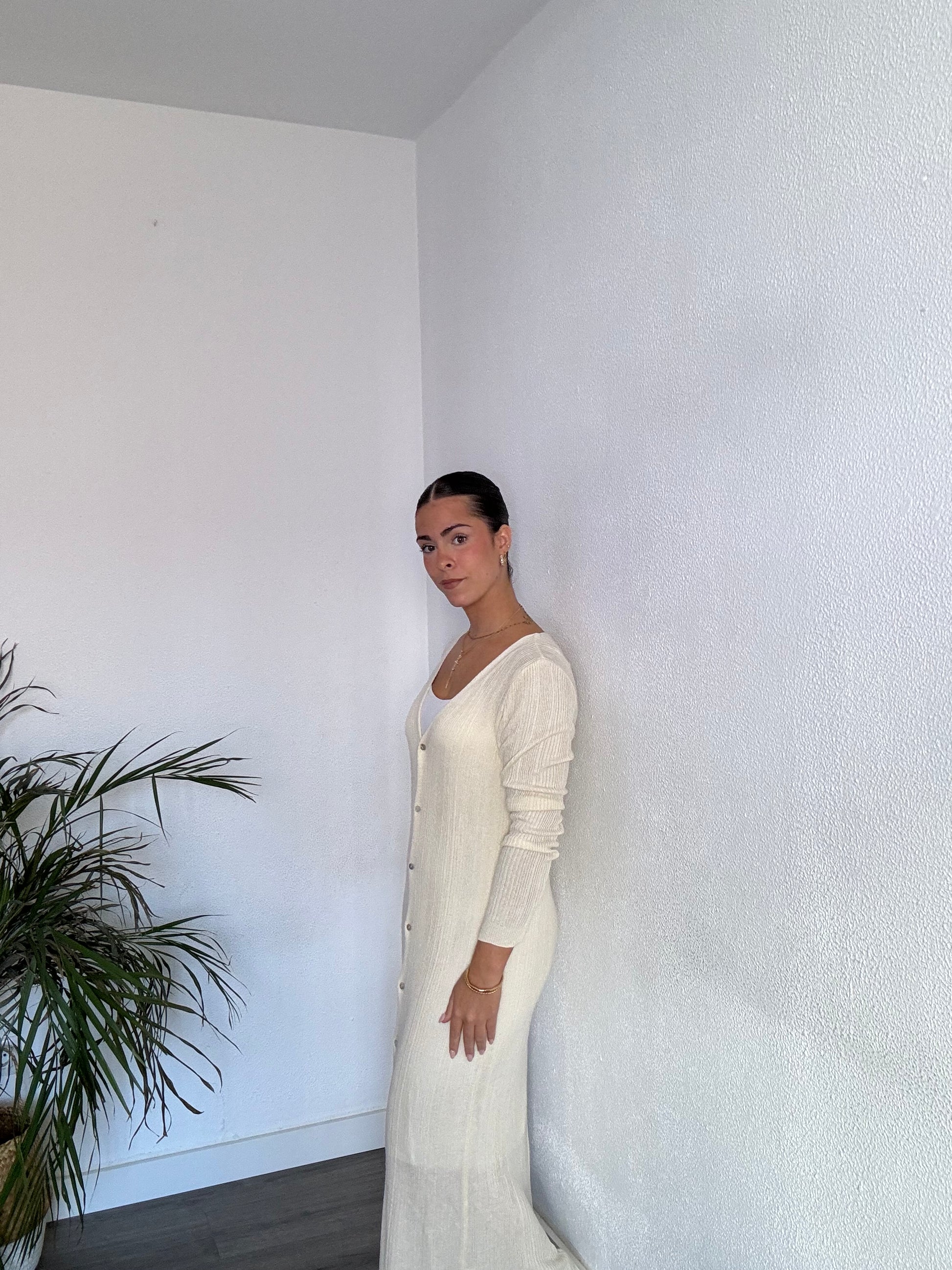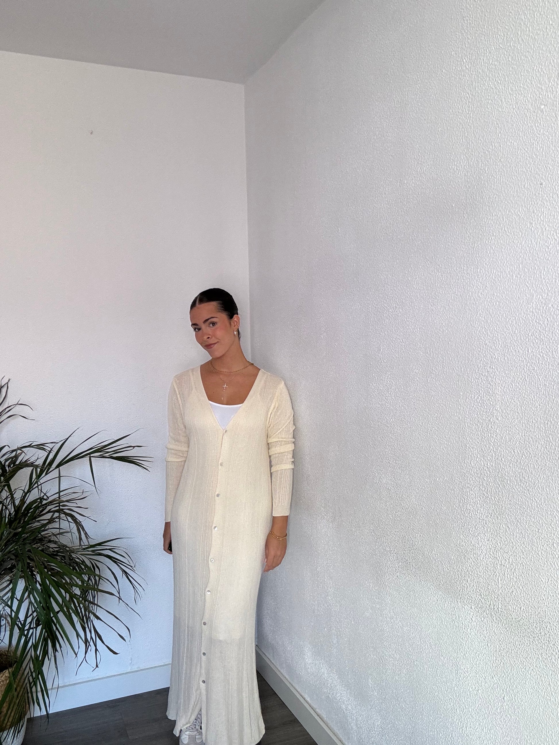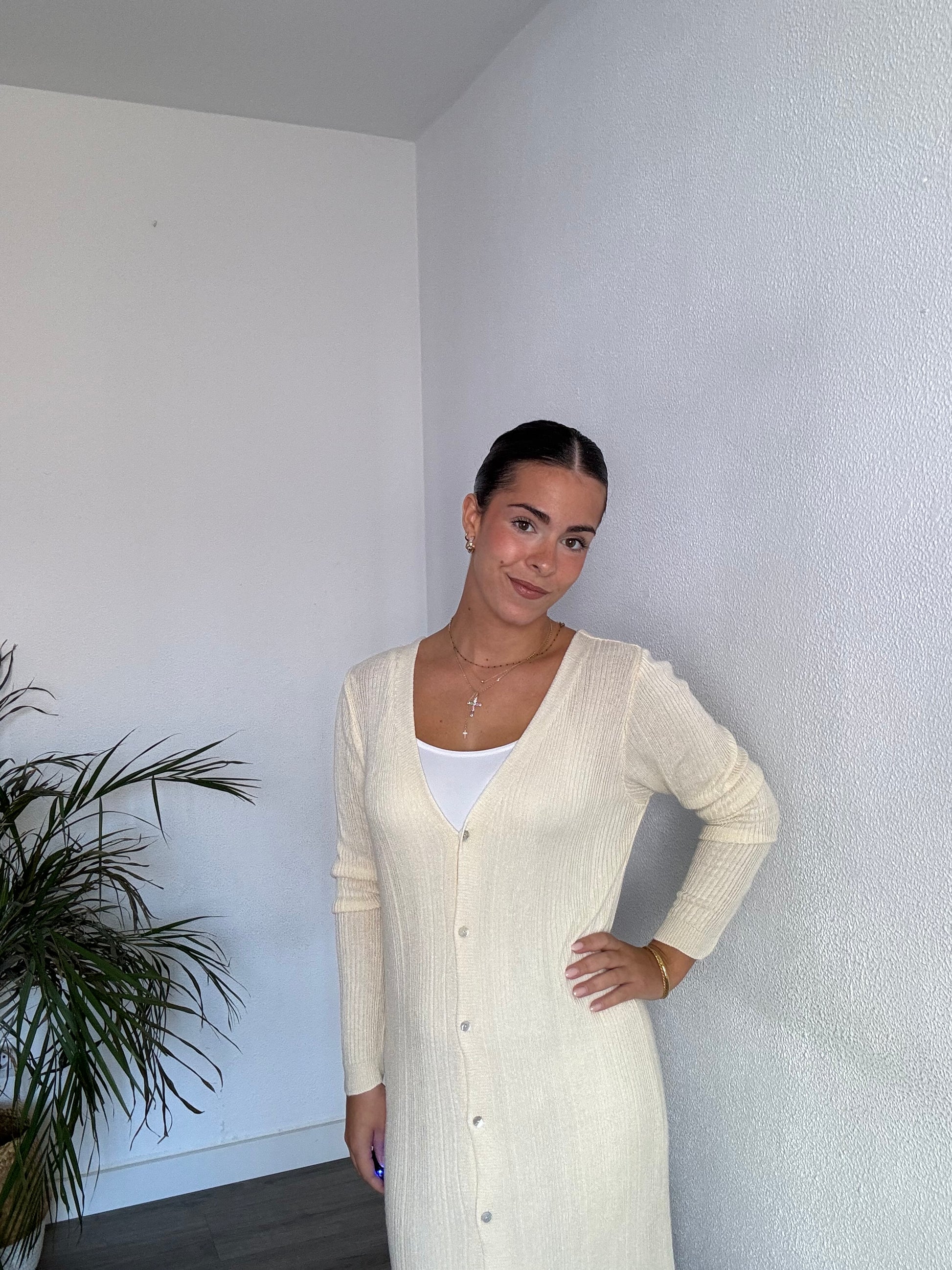 Vestido midi de punto con manga larga y abotonado delantero. Talla única